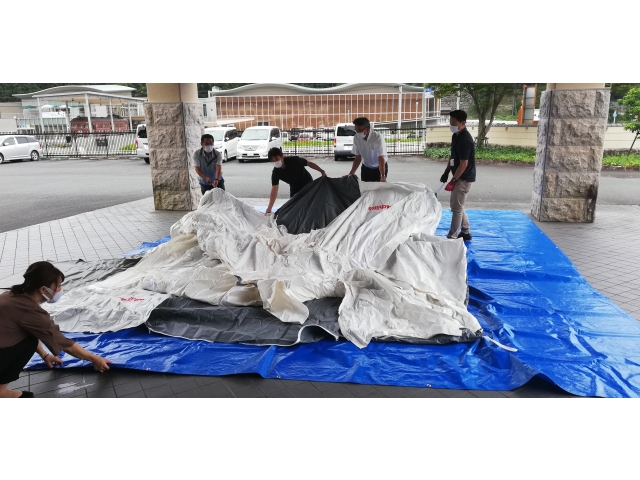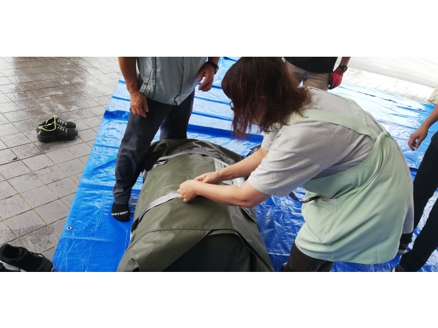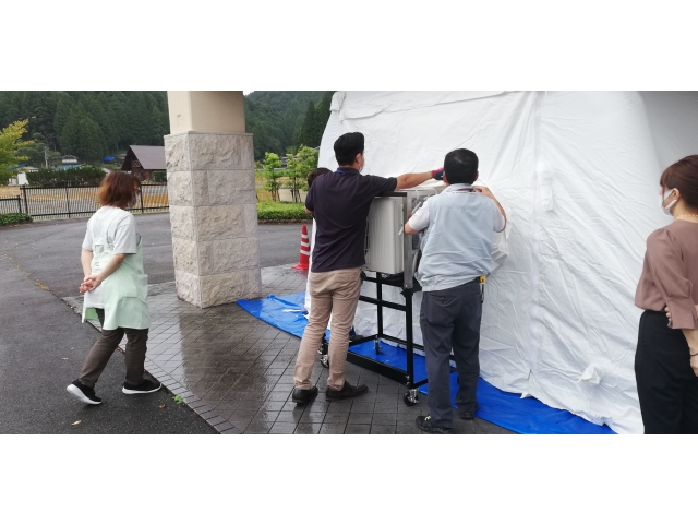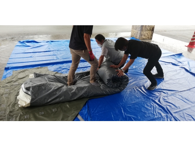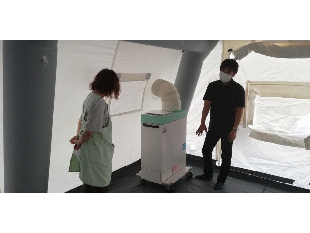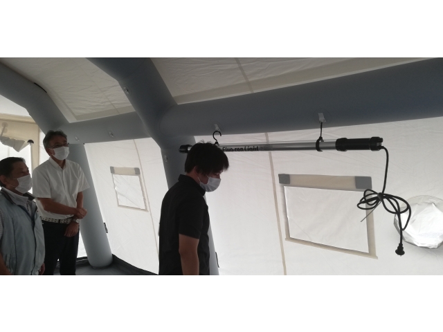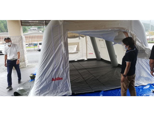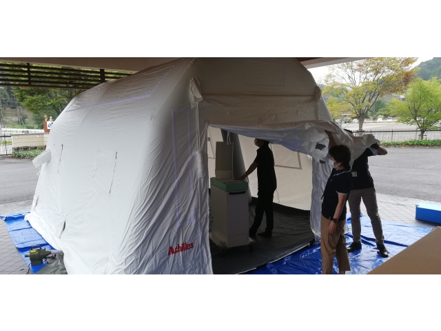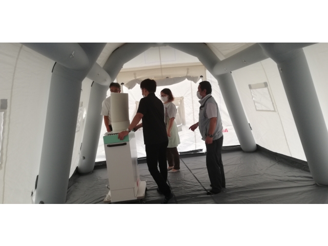 設置には最低二人必要ですが、慣れてくれば20分ほどで設置できるとのこと。大勢いればエアーテントが膨らむ間に必要物品を準備、搬入することも、感染者のケアを行うこともできます。