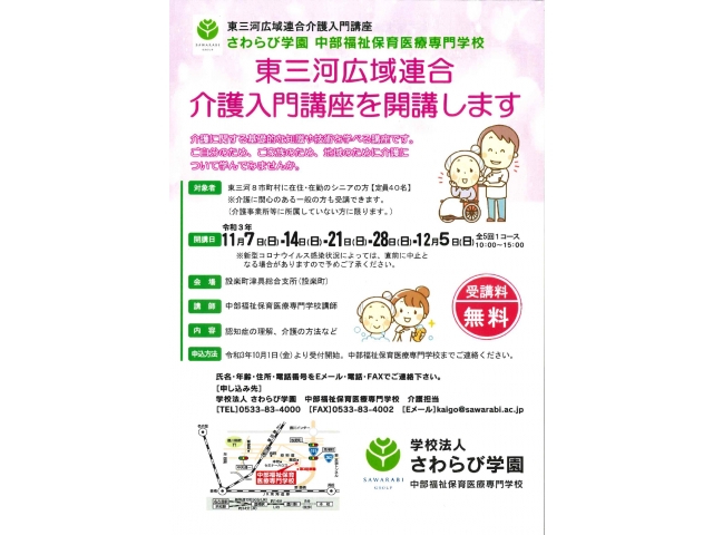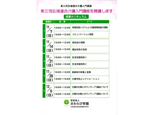 この講座は、11/7~本日12/5まで計5日間、東三河8市町村に在住、在勤のシニアの方で、介護に関心のある方を対象とし、無料で参加できる講座となっています。介護保険制度、介護予防、認知症や介護方法について学び、本日は最終日で『介護の仕事とボランティア活動について』がテーマでした。