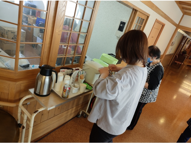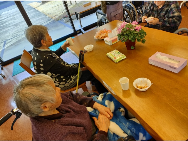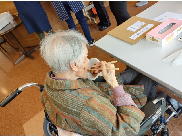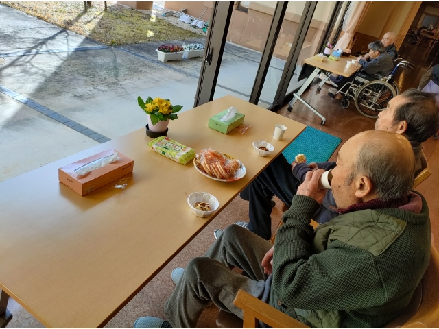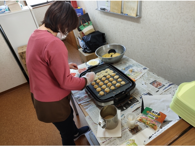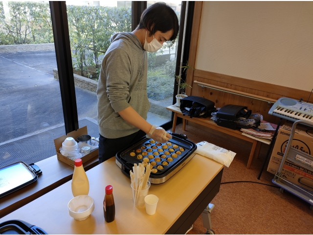 「私にもたこ焼きおくれん。」「熱くて美味しいぞん。」調理するのは介護員。いつもと違った忙しさも、今日は楽しい!お昼ご飯を済ませた後でも、タコ焼きは別腹?皆さまあっと言う間に「ごちそうさまでした。」
