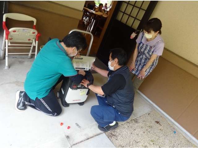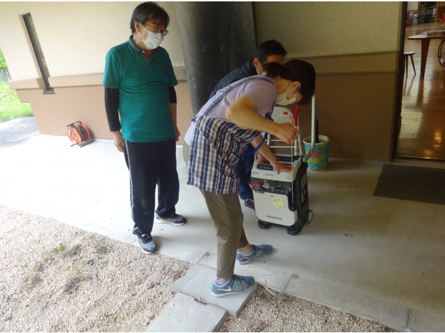 自家発電機は、1階は各ユニットに設置してあり、誰でも使えるように操作手順を確認します。いざという時に使えるようにするのが目的です。