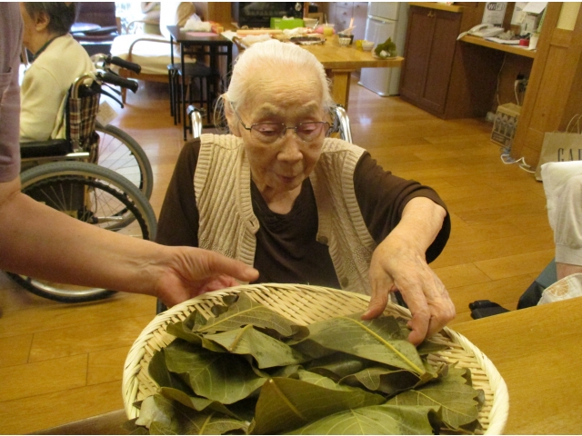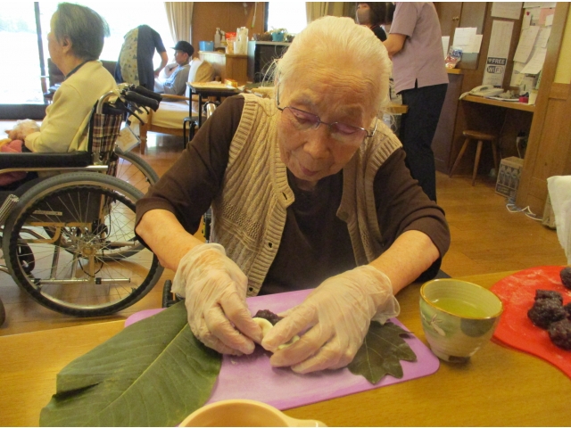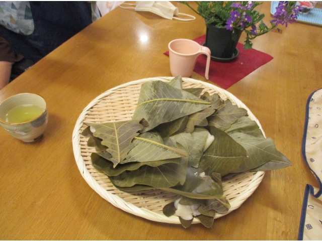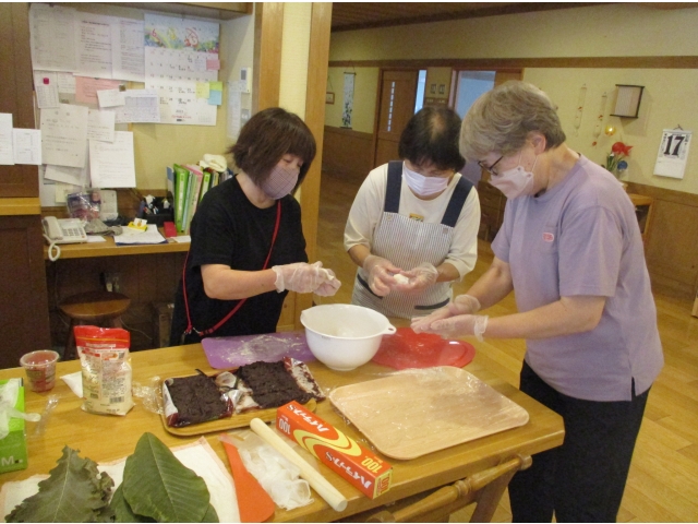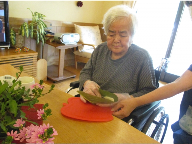 材料の準備や下ごしらえは職員が、餅で餡を包み柏や朴の葉で巻く作業は入居者様にお願いしました。