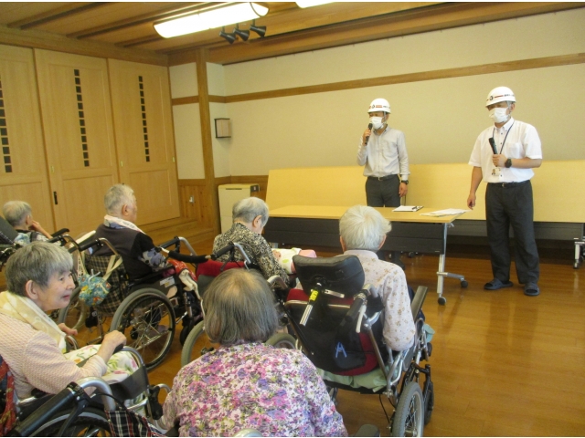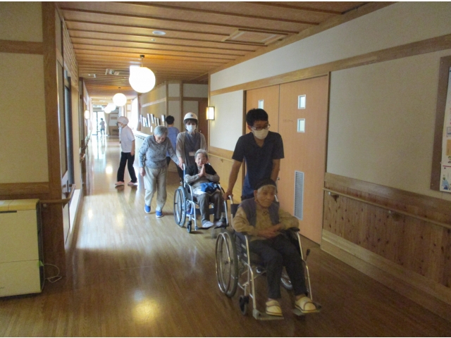 今回は1階ユニットの入居者さまを対象とした避難誘導訓練を行いました。限られた職員でいかに多くの方の避難を安全に迅速に行えるか、繰り返しの訓練が重要となります。