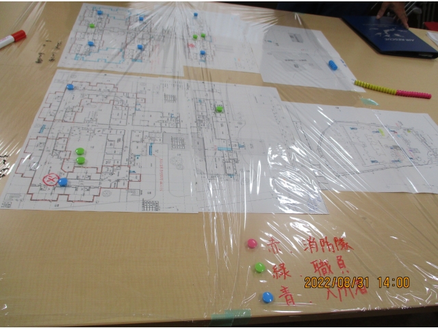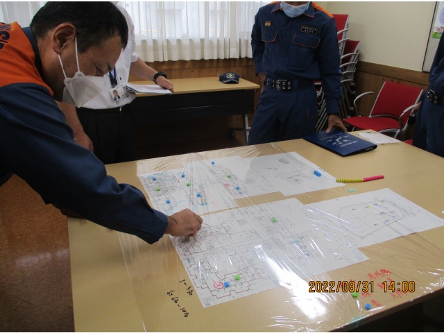 設楽苑の配置図を見ながら、日中1階居室、2階居室からの出火、夜間1階居室、2階居室からの出火を想定し、職員が何人配置されているのか、避難誘導はどの様に行うのか、避難経路は適切かなどを、設楽分署の署員と確認を行いました。