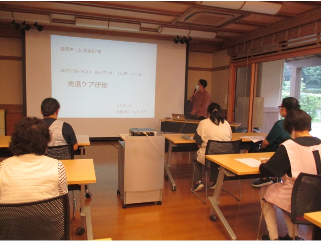 9/15、9/22には、よりそっとの後藤様を講師にお招きし、褥瘡ケア研修を行いました。褥瘡の定義と発生メカニズム、悪化の原因、予防策についてスライドを見ながら知識を深めました。また、褥瘡悪化に伴う様々な障害を知り、いかに予防が大切であるかを再確認しました。