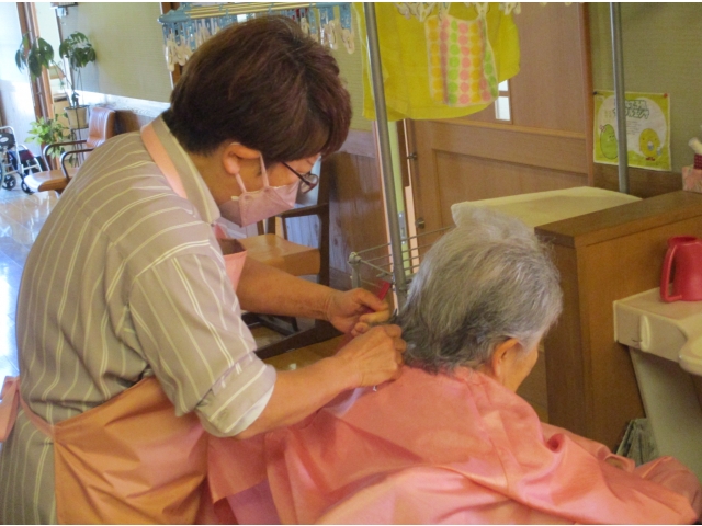 愛厚ホーム設楽苑では、毎月地元の理髪店、美容室の協力を得て、理美容サービスを提供しています。 今日は美容の日、(新城市大海)東京屋美容室さんが来てくれました。 希望を聞きながらカットと毛染めを行ってもらい、きれいになった姿に入居者さまも満足された様子でした。いくつになっても身だしなみは大切ですね。 10年ほどご協力をいただいている東京屋美容室の美容師さん。いつもありがとうございます。これからもよろしくお願いいたします。
