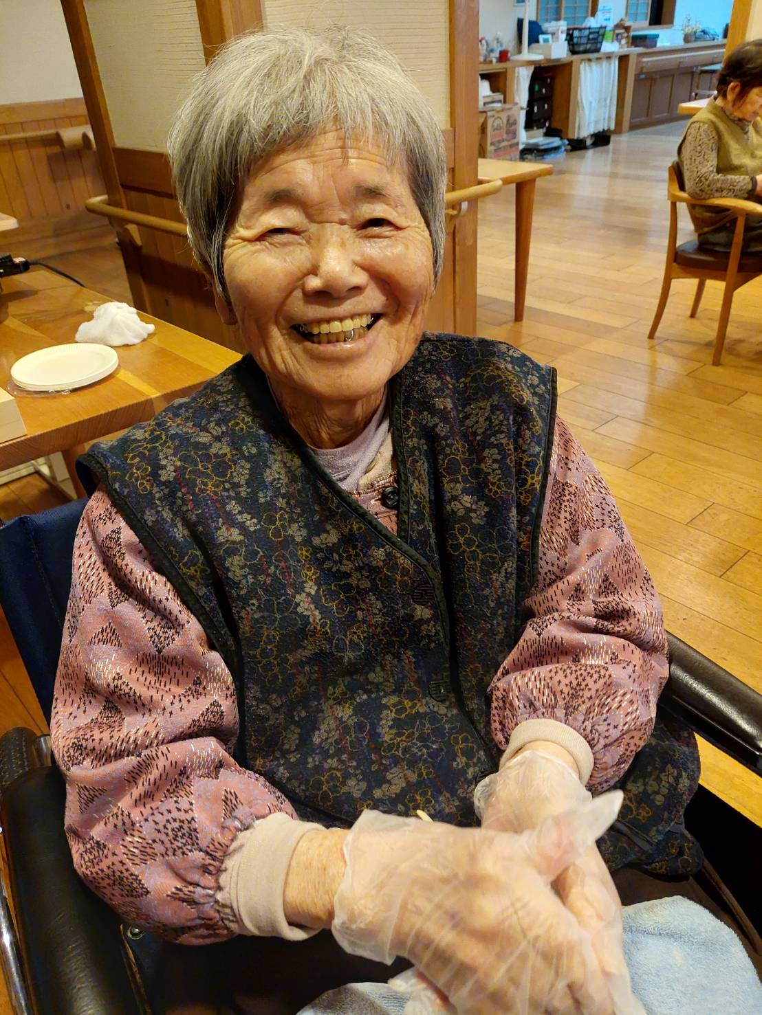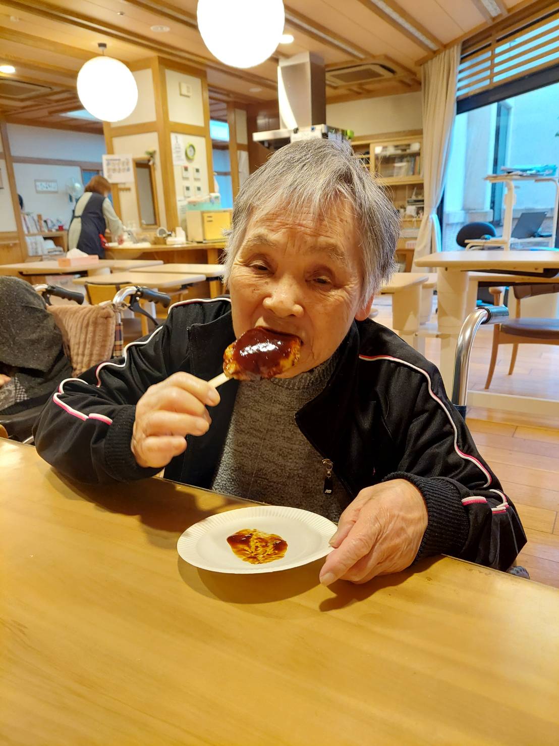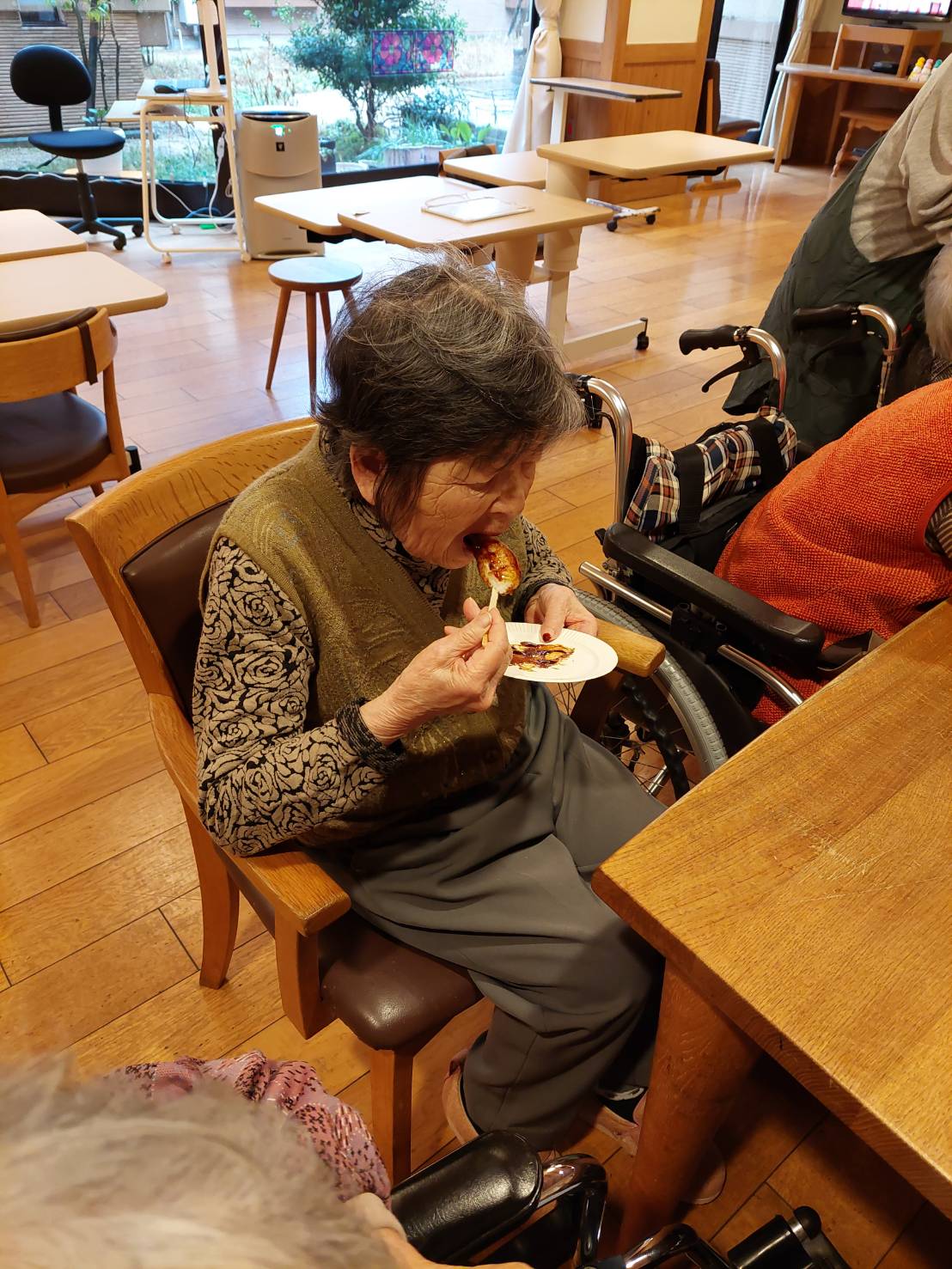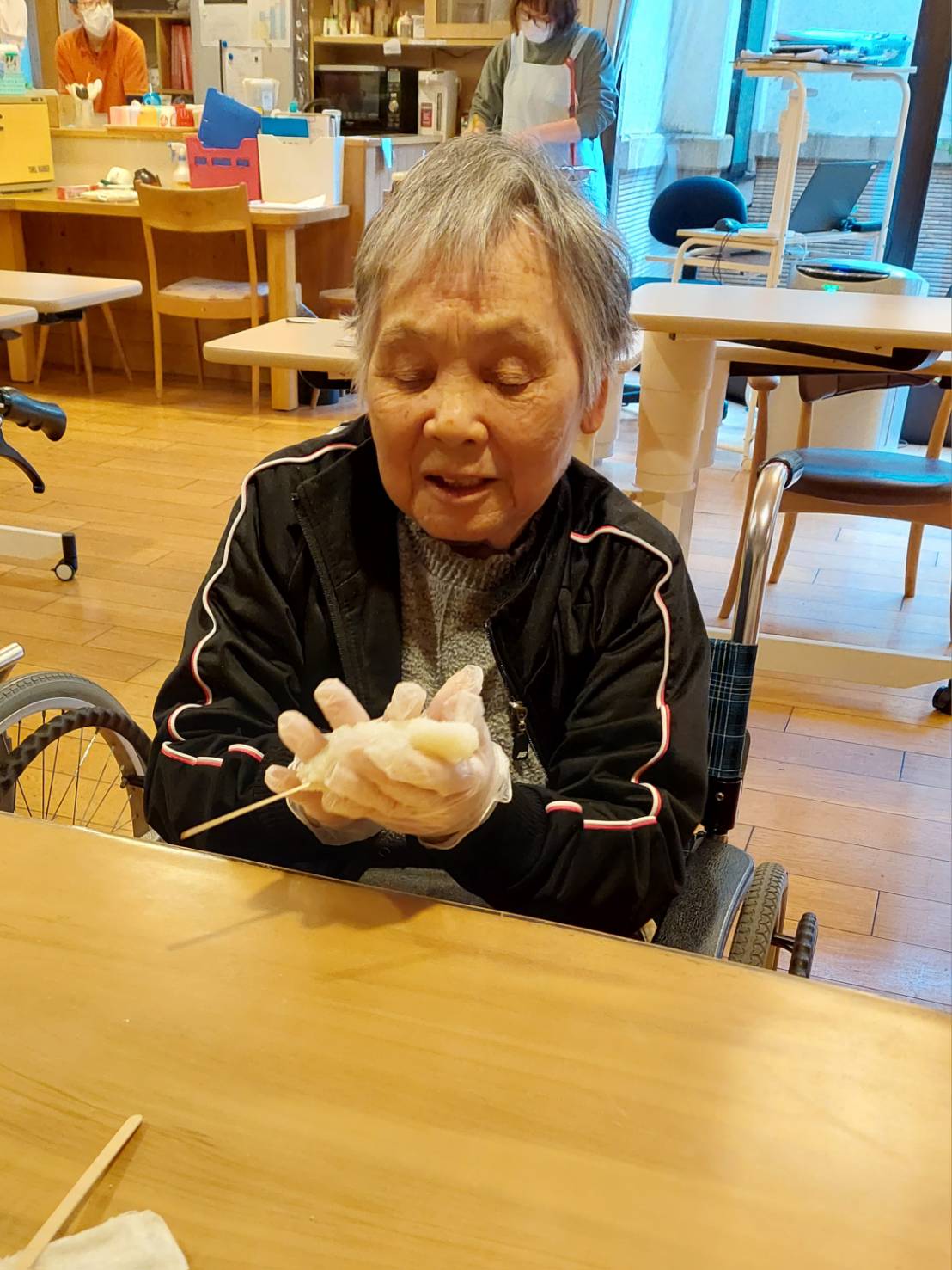 せせらぎの家で皆さんが大好きな五平餅づくりをしました。 慣れた手つきはさすが! かっぽう着もお似合いです🌝 協力し合ってごはんをつぶし 串につけて、ホットプレートで焼きました。