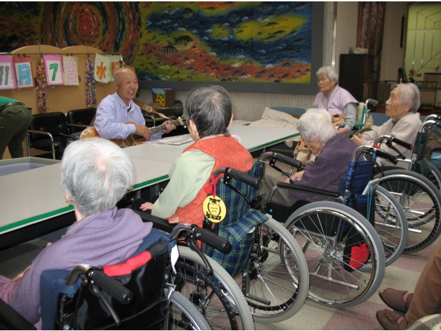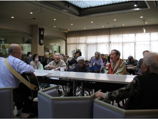 ある昼下がりのこと、事務所に居ると、どこからかギターを奏でる音が…(8分音符)(8分音符) 1階のロビーでショートステイのK様のご家族が弾き語りをして下さっていました。 素敵な歌声で「ふるさと」「若者たち」「川の流れの様に」など歌ってくださいました。
