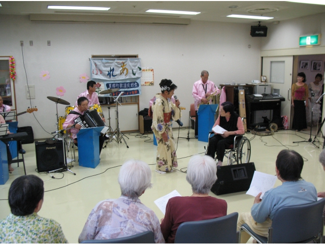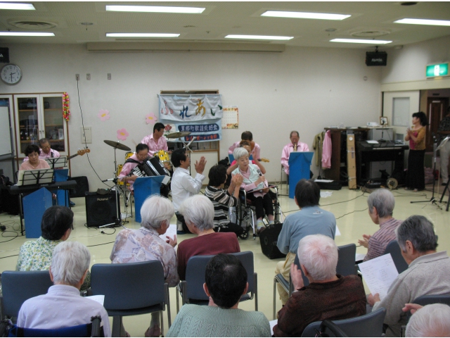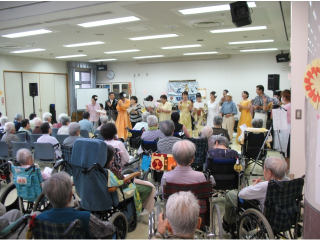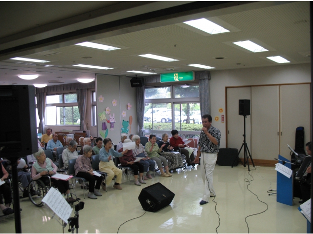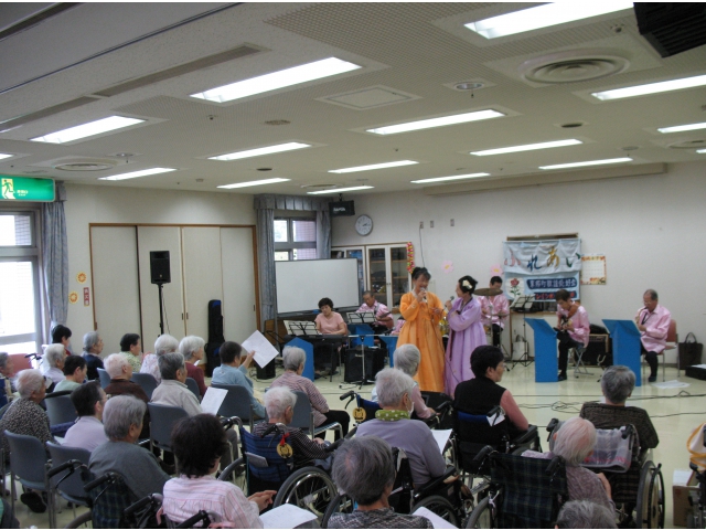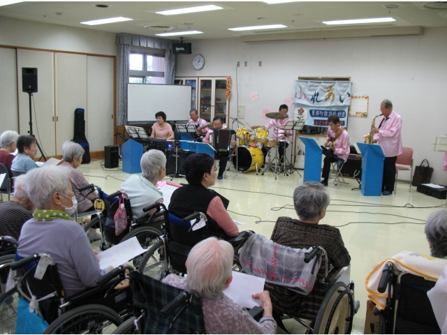 今日は毎年恒例となっている東郷町歌謡愛好会の皆さんが来苑され、生バンドによる演奏と歌の披露が行われました。利用者の皆さんも楽しみにしておられたため、大盛り上がりとなりました。