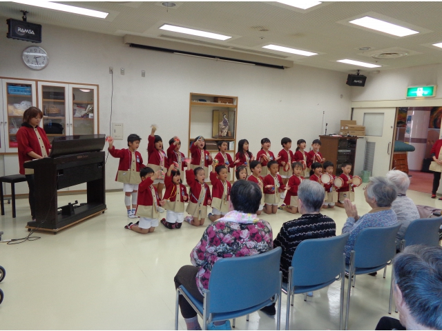 かけ声の後は、みんな大好き楽器演奏のお披露目です。可愛いさたっぷりの園児さんの姿に利用者さんもメロメロです(8分音符)