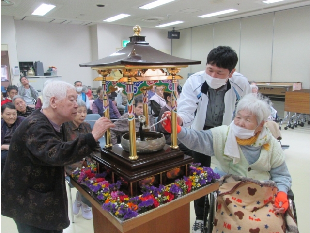4月6日(月)お釈迦様の誕生日をお祝いする花まつりを行い、40名の入居者様が参加されました。