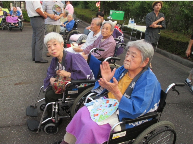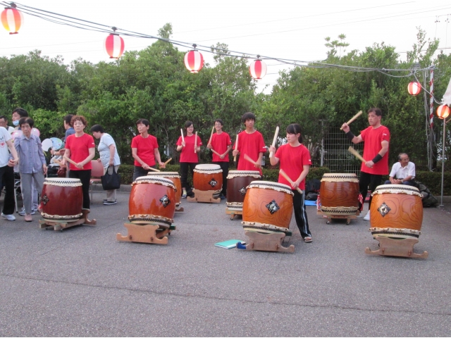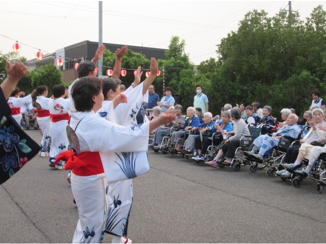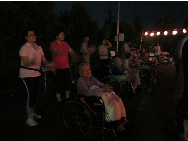 地域の有志による太鼓の演奏や、東郷音頭保存会による盆踊りなどで、会場は大変な盛り上がりでした。利用者様も何日も前から指折り数えて楽しみにしていた行事とあって、曲に合わせて身体を動かしたり、手拍子をしながら歌ったりする姿が見られるなど、とても楽しまれていた様子でした。