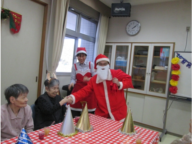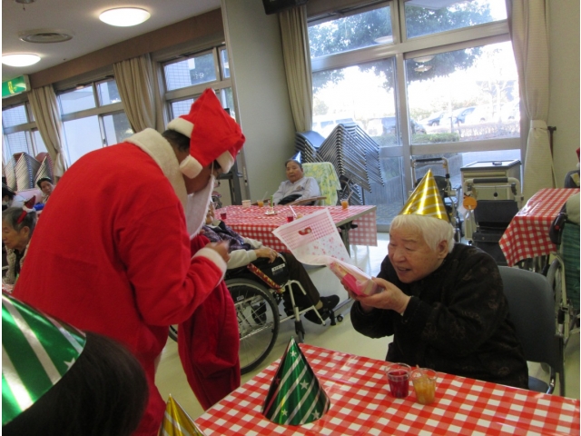 クリスマスソングが流れる中、2人のサンタクロースが登場!!(正体は…わかるかな??)サンタの登場に、会場は大盛り上がり!!!サンタからクリスマスプレゼントをもらい、利用者の方はとても喜ばれていました。