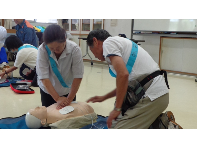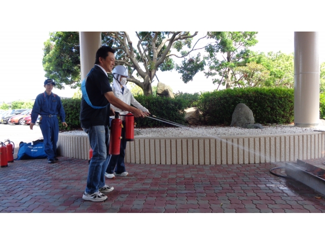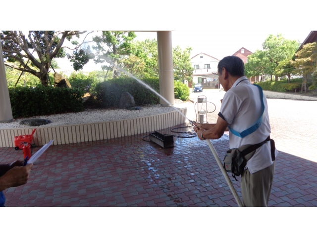 次に消火訓練、放水訓練、AEDの取り扱い訓練等について、尾三消防署の職員の指導を受けながら、実際に道具に触りながら具体的な取り扱いを体験していただき、参加者からは「ホースって意外と重いんだね」「消火器が15秒しかもたないなんて知らなかった。」「AEDの体験が出来て良かった」等の声が聞かれました。