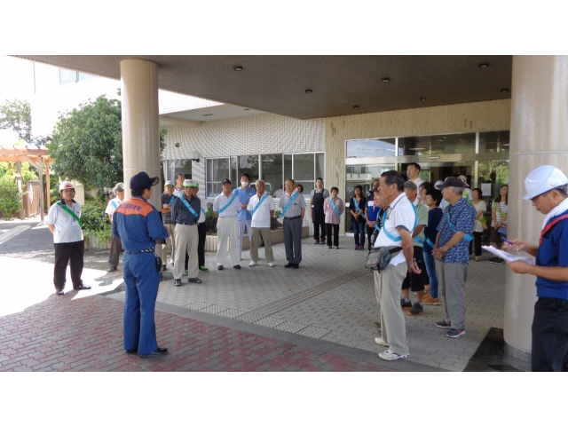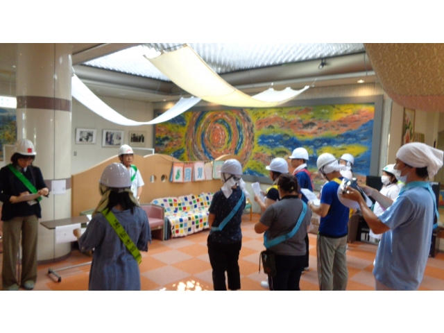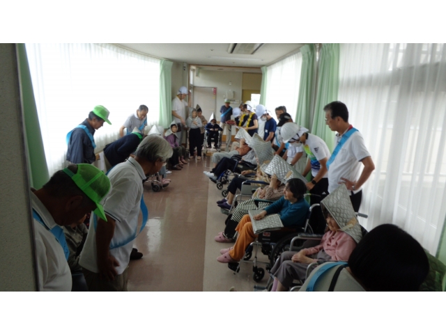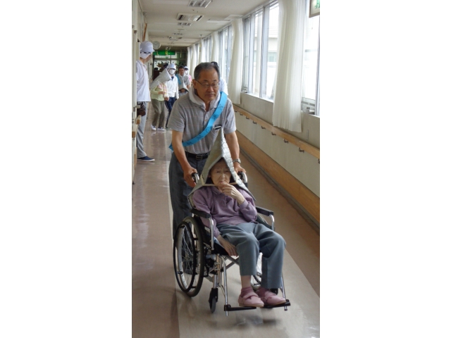 まずは、厨房からの火災を想定した避難誘導訓練を実施し、地域住民の皆様にも避難誘導の体験をしていただきました。参加された方からは「車椅子の人も多く、とくに夜間の避難などは人手がたくさん要る事がよく分かりました」等の声が聴かれました。