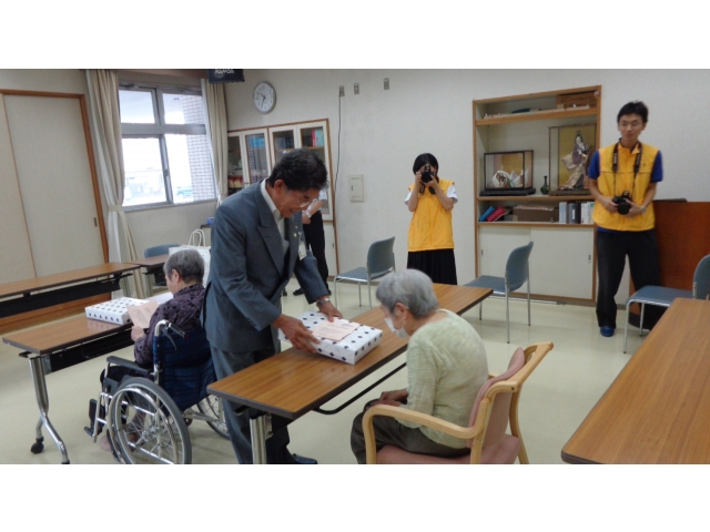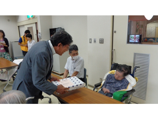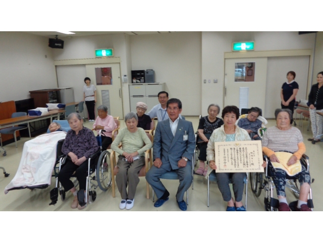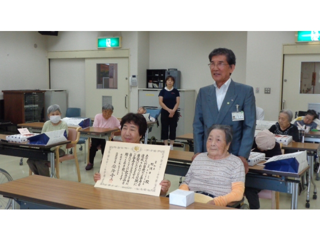 平成28年9月16日(金)東郷町長が来苑され、敬老慰問の会を行いました。今年は満88歳の方が7名、満100歳の方が1名の、計8名の方が参加され、賑やかな雰囲気の中で、ご長寿のお祝いをしました。東郷町長からお祝いのお言葉や記念品の贈呈をしていただき、参加された方からは「長く生きたなぁ。幸せ。」などの声が聞かれました。いつまでもお元気で、長生きしてくださいね!!