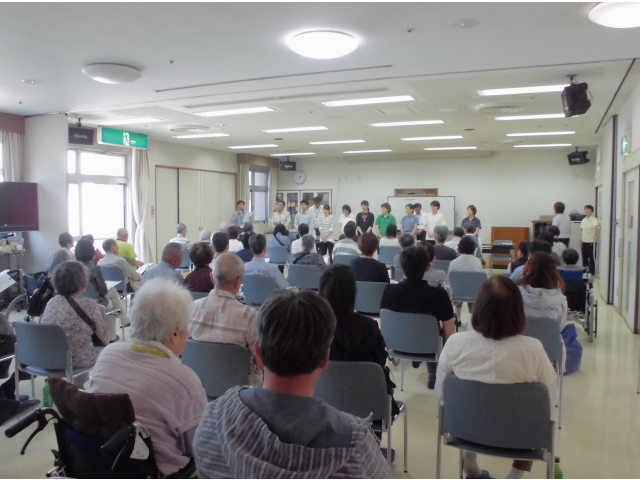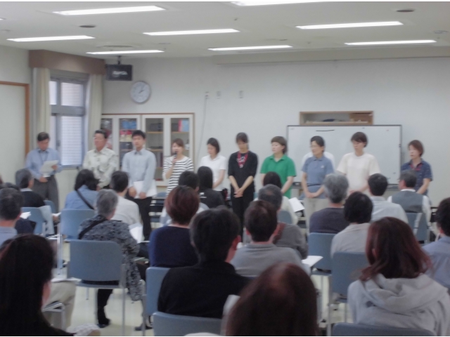 会の冒頭に、今年度よりお世話をさせていただく新たな職員の紹介をした後、苑長をはじめ各担当職員から当施設の経営方針・目標、行事予定、料金の改定、介護力向上、健康管理等の説明を行い、食事の提供などについて質疑応答がありました。