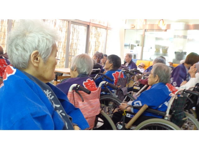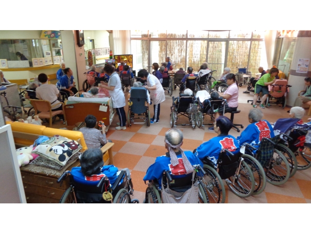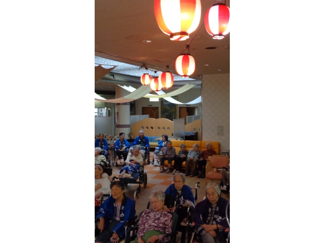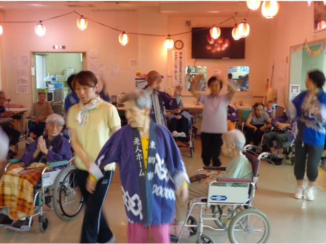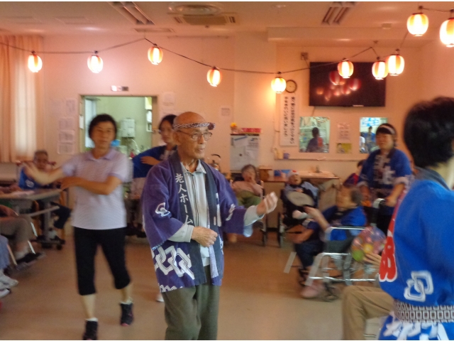 ご利用者様には、室内でミニ盆踊り大会を楽しんでいただき、参加された方からは、「長生きするとこんなこともあるね」「この台風も長寿命台風らしいね」「来年がもう楽しみ」等、とても前向きで明るい声が聞かれました。