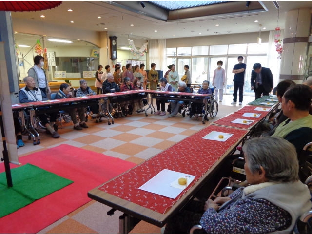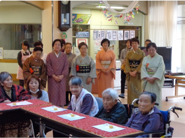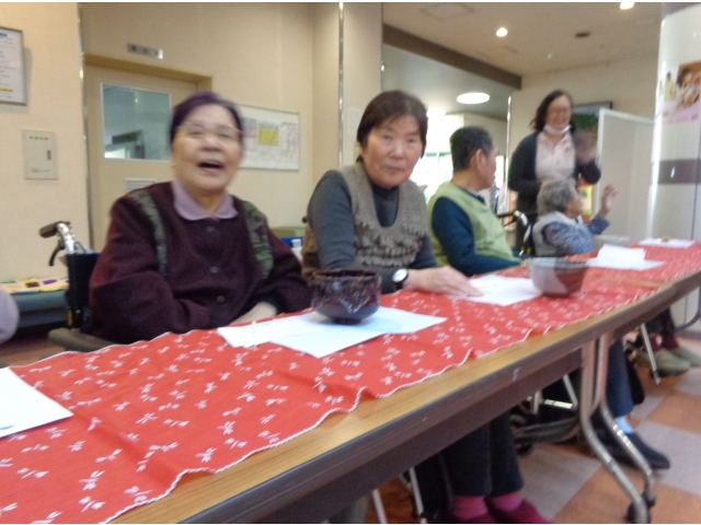 平成30年1月11日に、初釜を行い、約60名の利用者様が参加されました。着物を着たボランティアの皆さまに、抹茶をたてていただき、いつもと違う雰囲気の中お茶をいただきました。参加された方からは、「本格的でおいしいね」等の声が聞かれました。今年も元気で幸せに過ごしましょう!