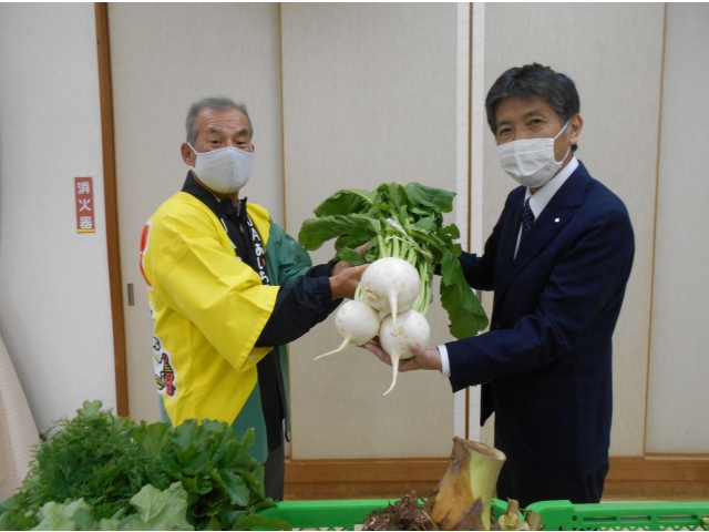 令和2年11月7日(土)JA愛知尾東農協様から野菜と果物の寄付をいただきました。かぶやネギ、さつまいも、みかん等の新鮮な野菜や果物をいただき、みかんを食べられた利用者様からは「美味い」と言われ笑顔が見られました。いただいた野菜や果物は給食やデイサービスの調理レクに使わせていただきたいと思います。ありがとうございました。
