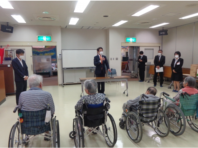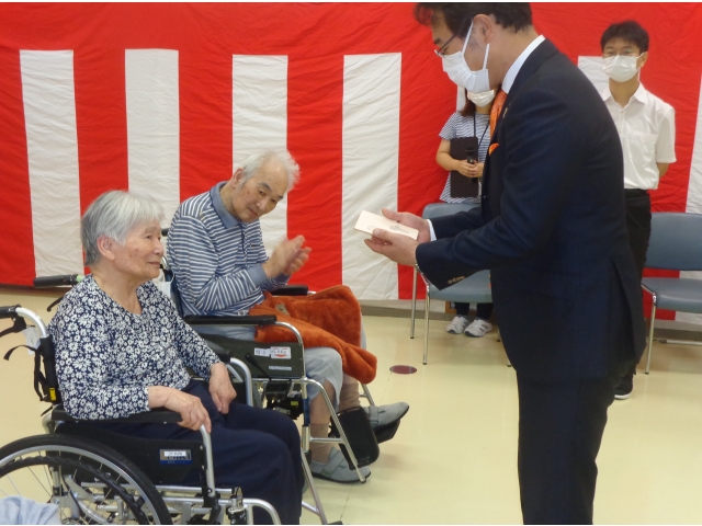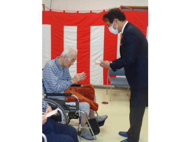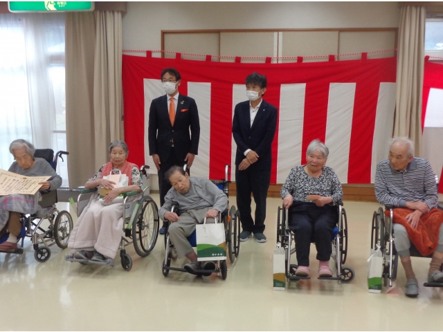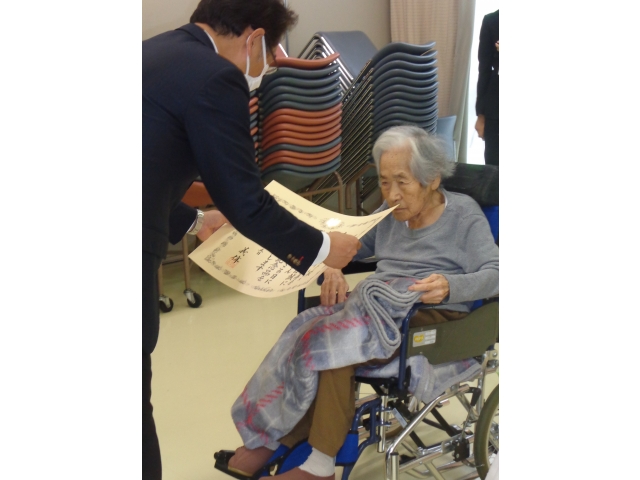 9月20日の「敬老の日」にともない、東郷町長による敬老訪問が行われました!今年は、満100歳 1名、満88歳 4名 の利用者様がご長寿のお祝いの品を受け取りました。