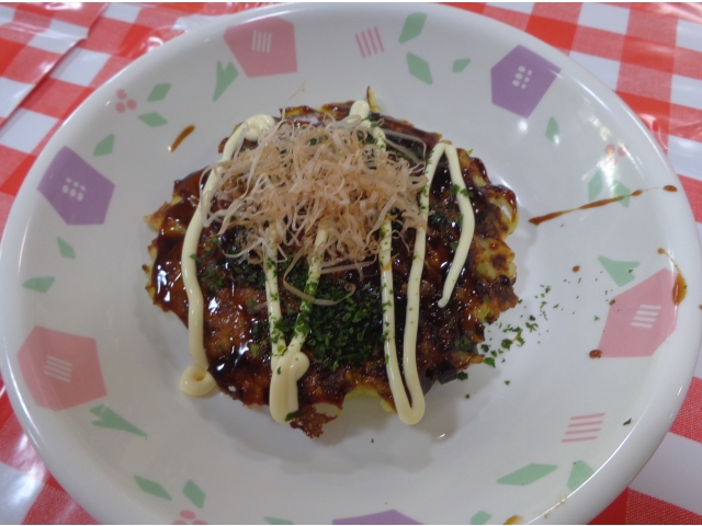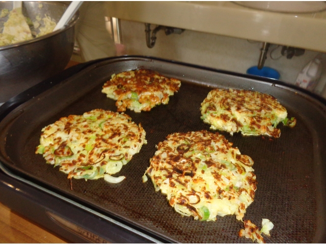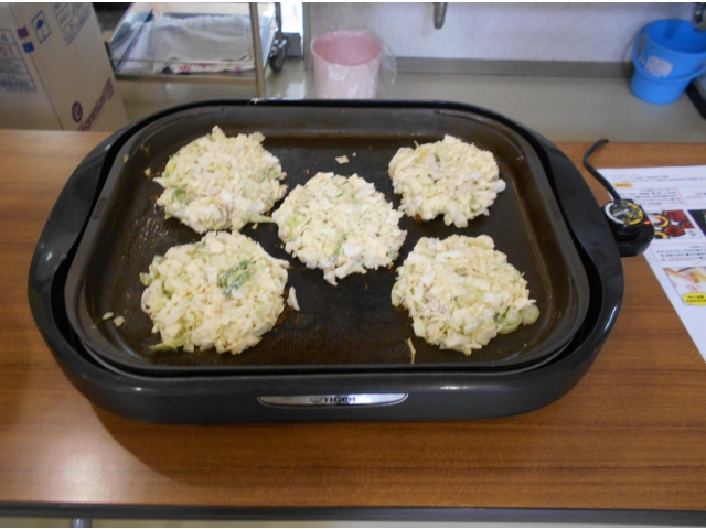 お好み焼きは昼食前にホットプレートで手作りしました!