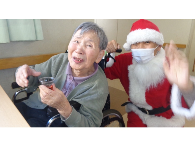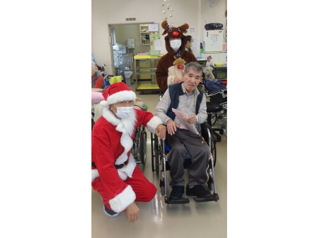 サンタさんとトナカイさんが食堂、デイフロアに登場し、利用者の皆様にプレゼントを手渡したり、記念撮影に応じてくれました。