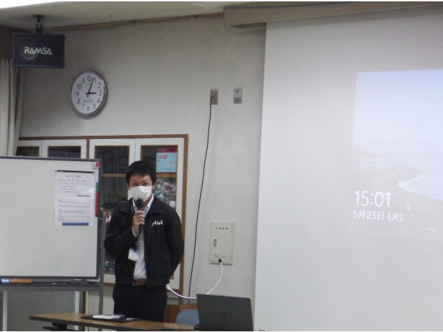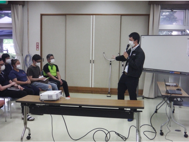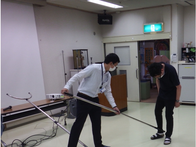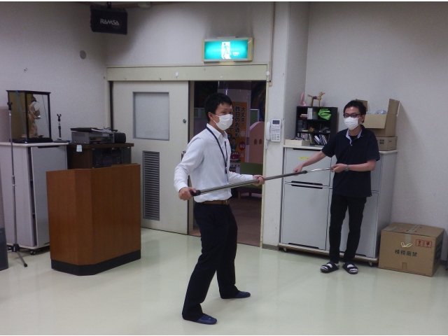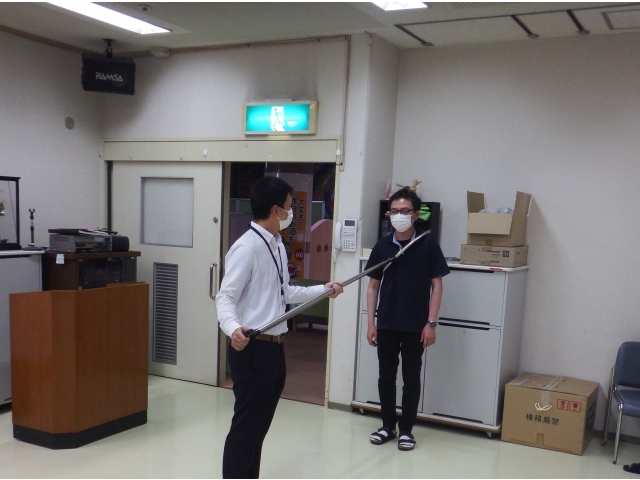 愛知警察署の生活安全課の署員の方に来ていただきました。 施設に不審者が現れた時、どのように行動するのかビデオを鑑賞しました。 また、実際に「さすまた」の使い方を指導していただきました。