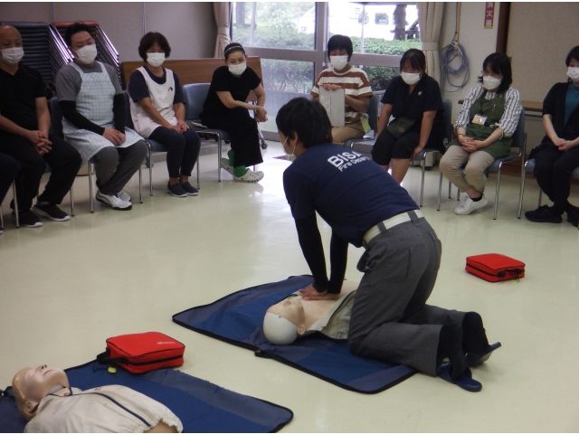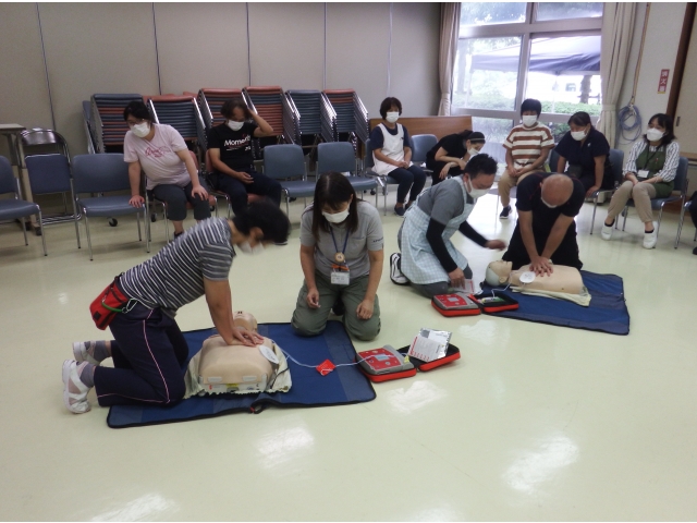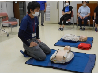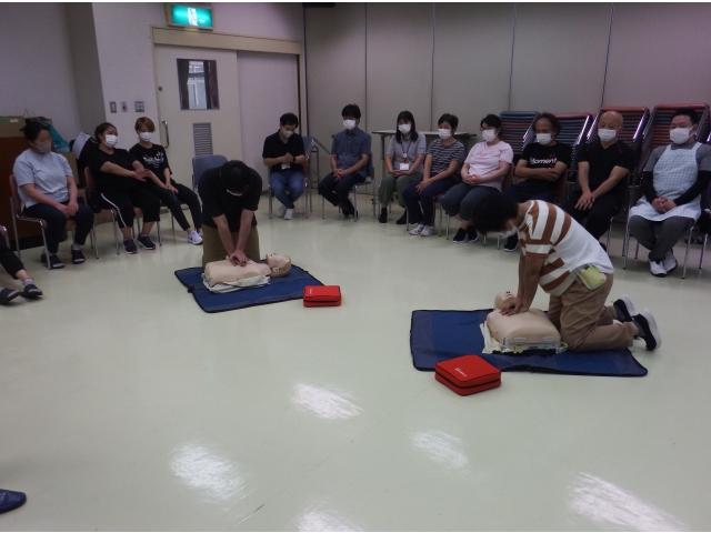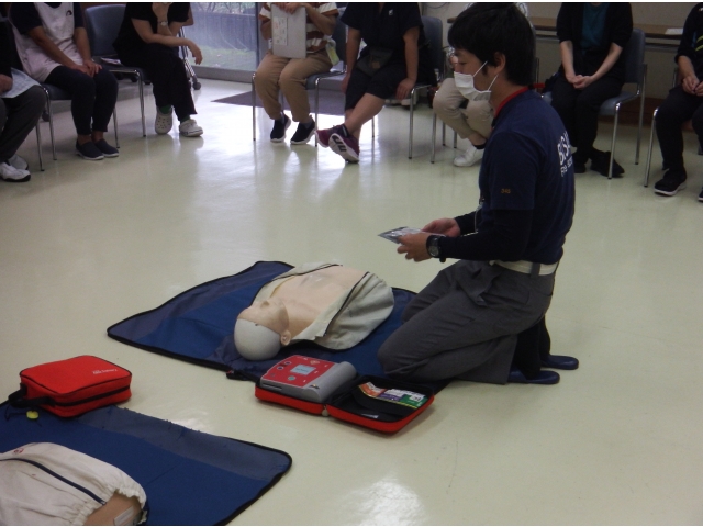 まず、人形を使って胸骨圧迫の態勢や押すリズムの指導を受けました。 その後、AEDの使用方法と手順を学び実践しました。