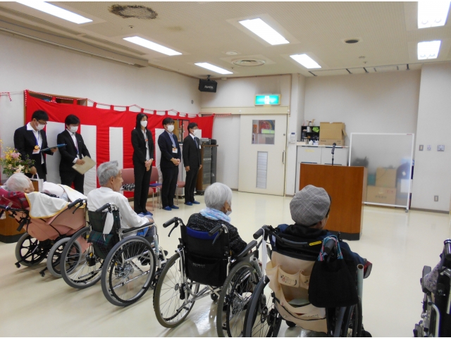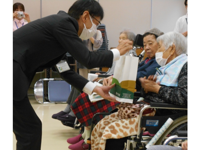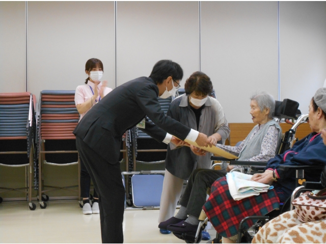 百寿(100歳)と米寿(88歳)になられた利用者5名が参加され、長寿の祝いとして賞状と敬老祝品をいただきました。