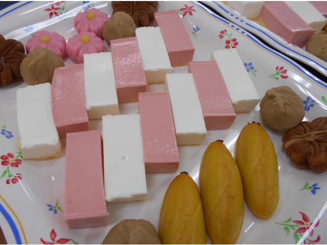 ケーキ2種類、スイートポテト、もみじ饅頭、練り切り、栗きんとん、水ようかん の中から選んで召し上がっていただきました。