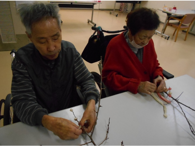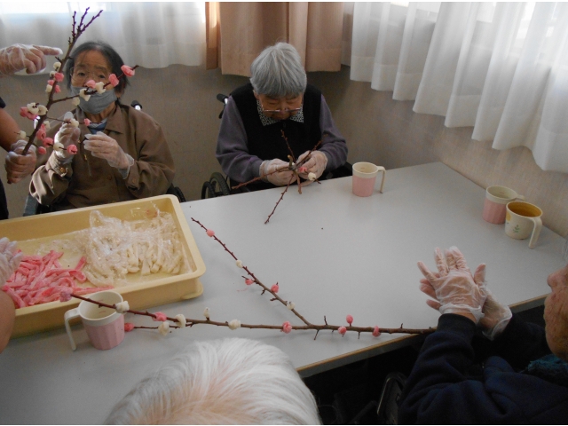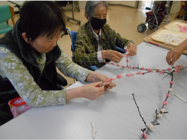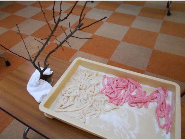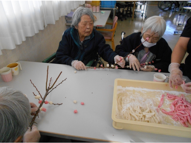 紅白のお餅を上手に枝へ付けています。 とても上手に仕上がりました。