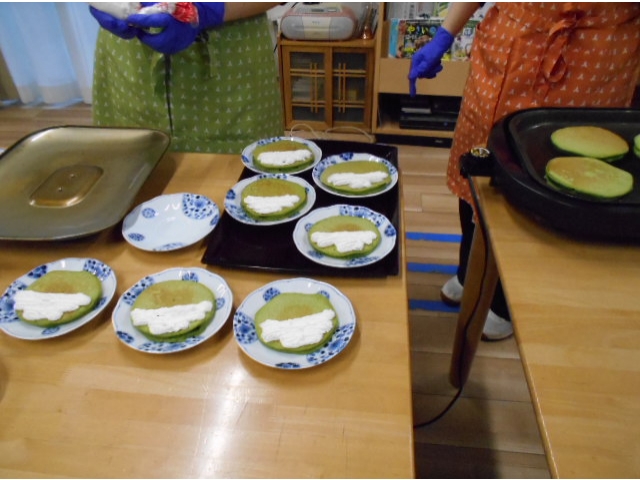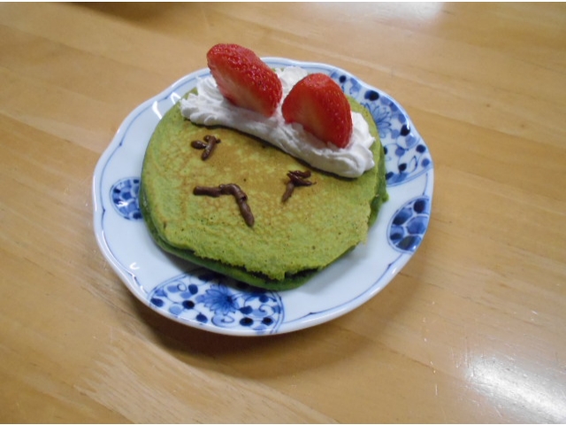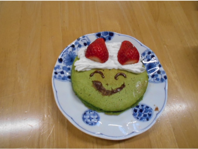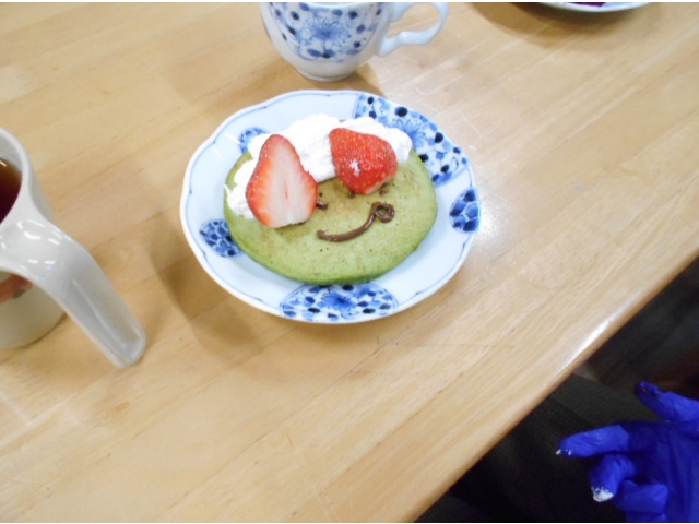 【鬼さんの抹茶パンケーキ】を作りました。 利用者様が角の部分のイチゴをつけてもらいました。いろいろな鬼ができあがり❣