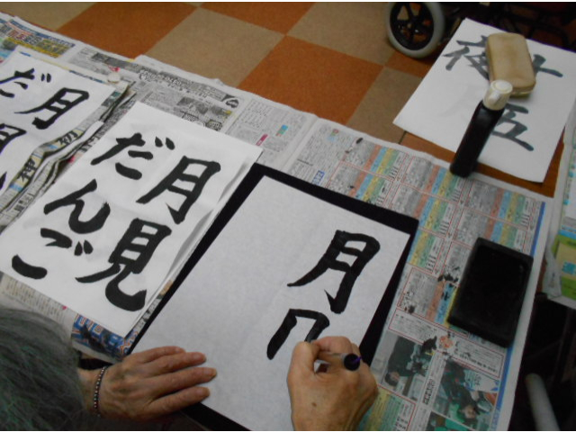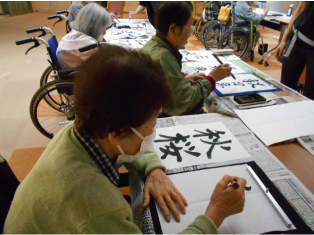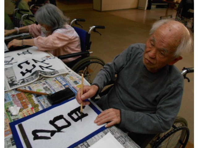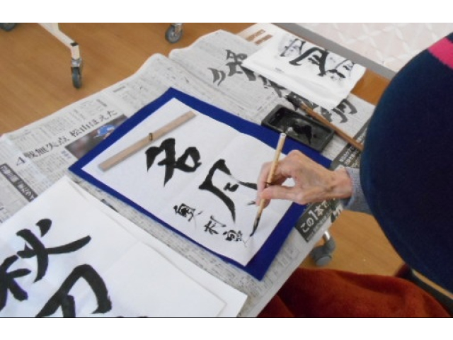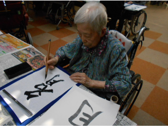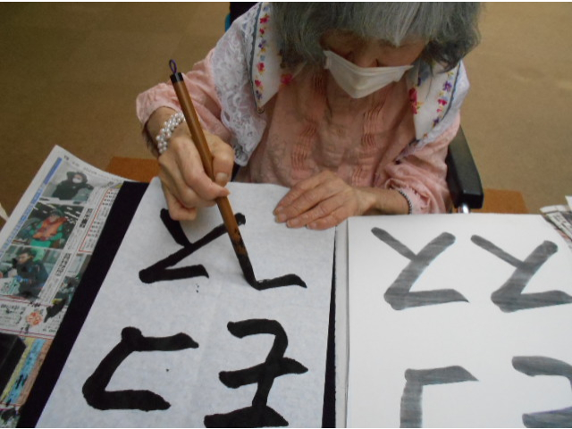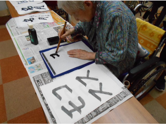 本日は、レクリエーションで習字を行い、利用者様に好きな言葉を書いていただきました。