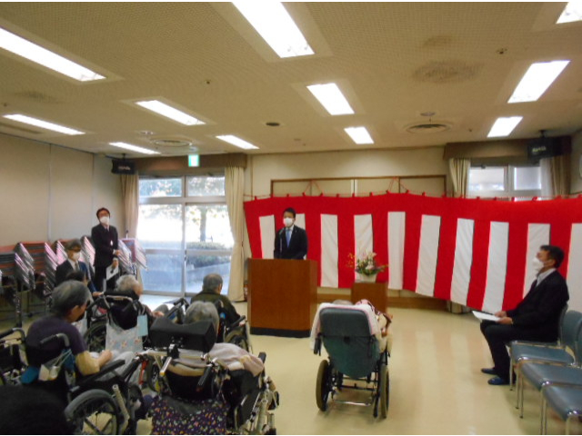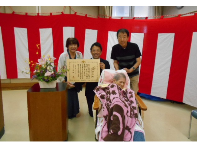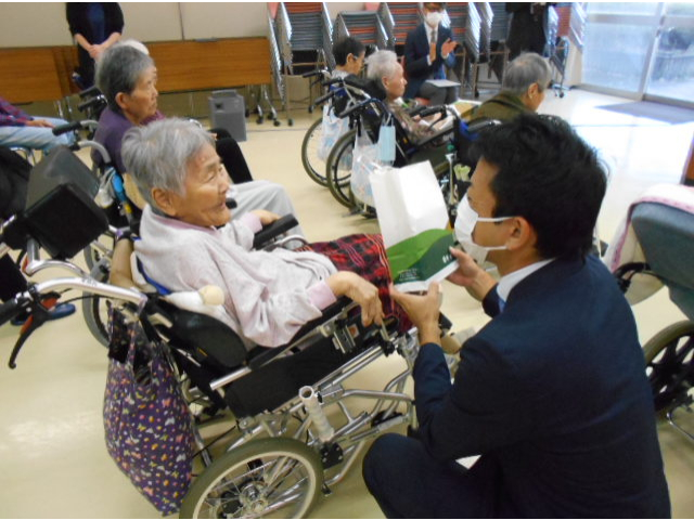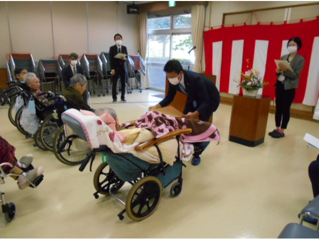 9月22日(月)、石橋東郷町長様始め5名の方が来苑され 100歳と88歳の利用者様に敬老祝品を手渡していただきました。