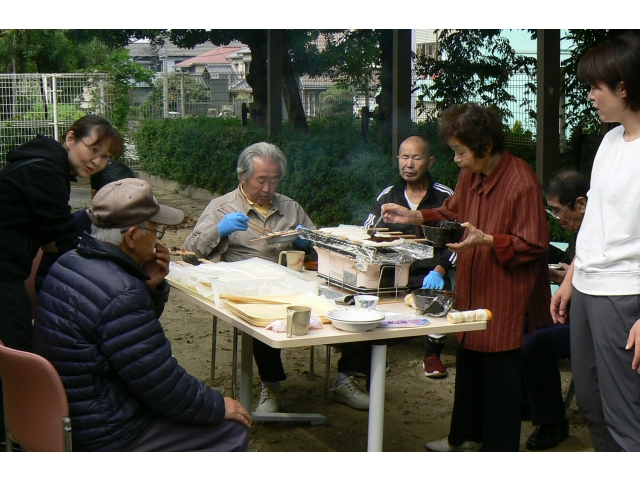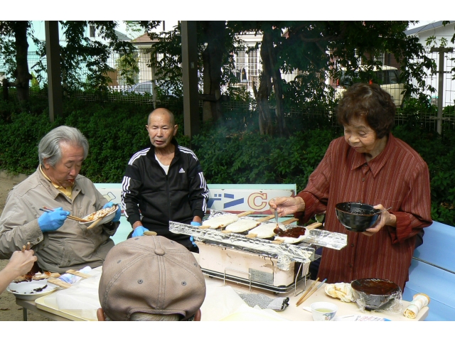 少し前はあんなに暑かったのに・・・と思う位に朝晩が肌寒く感じるようになりました。 東郷苑(特養)の秋の食事会の行事に合わせて、東郷庵(デイ)でも五平餅をいただきました!! 利用者の皆様と準備を行い、炭火でじっくり焼き上げ、各々の好みの焼き加減になったところで召し上がっていただきました。 大きな五平餅がすぐになくなり、「おかわり」と言われる方や、「外の食事もいいね。今度は焼き芋でもしたい!」との声が聞かれました。
