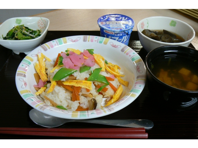 桃の節句も過ぎて、少し日にちが遅くなりましたが、お昼ごはんにと、利用者の皆さんと一緒に「ちらし寿司」を作りました。
