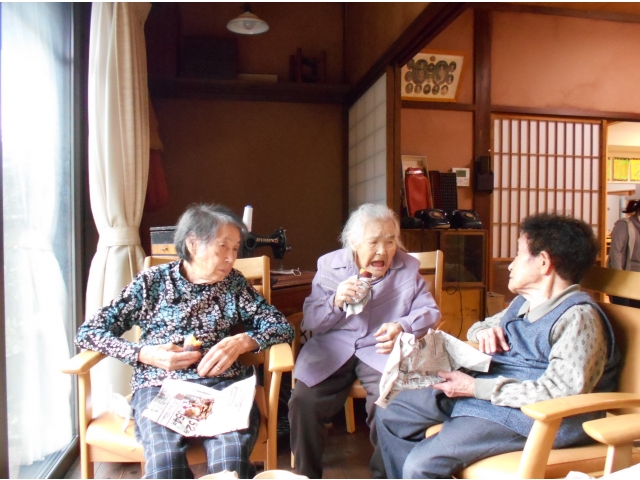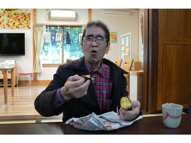 この日は天気がとてもよかったので、中庭で七輪を使って焼きました。東郷庵中に焼き芋の甘い匂いが漂っていました。焼きたてのお芋を皆さん笑顔で召し上がられ、「美味しいね。」や「久しぶりに食べたよ。」とおかわりされる方がたくさん見えました(*^^*)