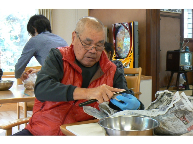 利用者様に具材の下準備をして頂きました☆男性利用者様も積極的に参加してくださいます!皆さん慣れた手つきであっという間に下ごしらえが完成です♪