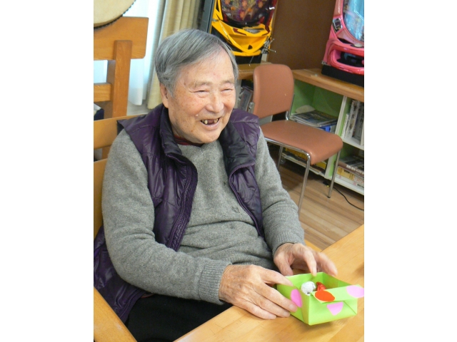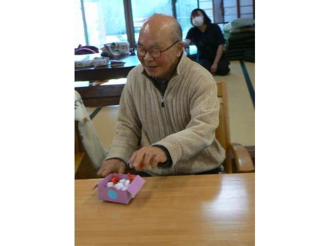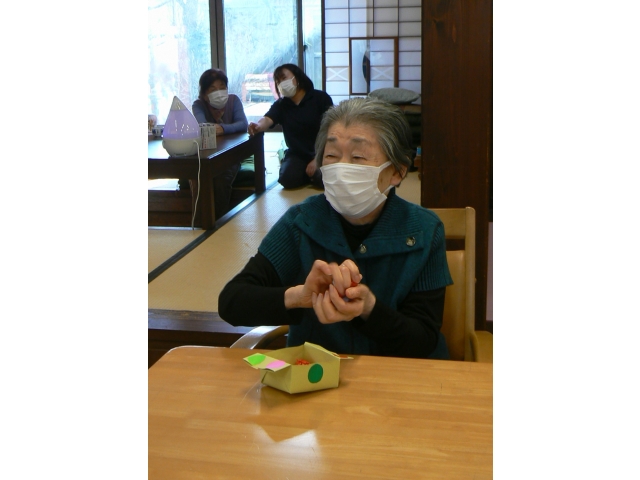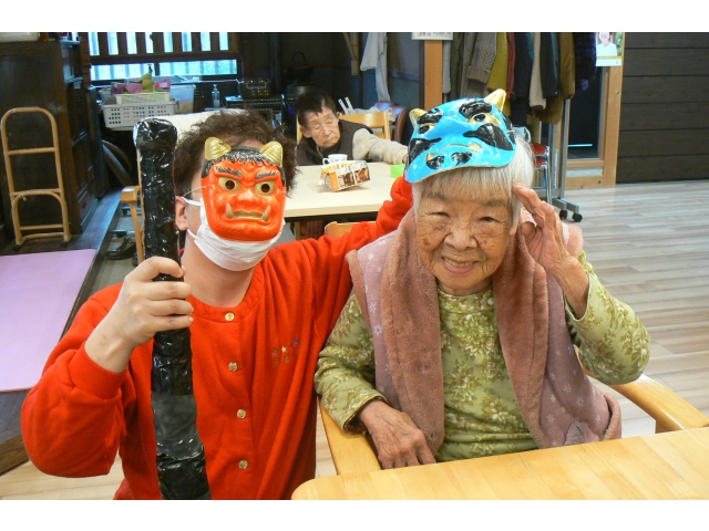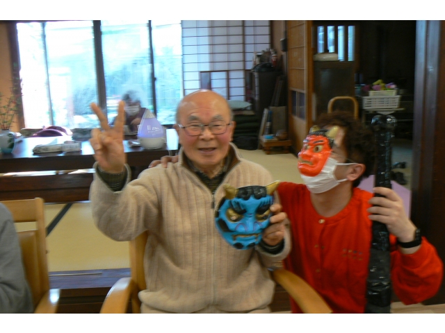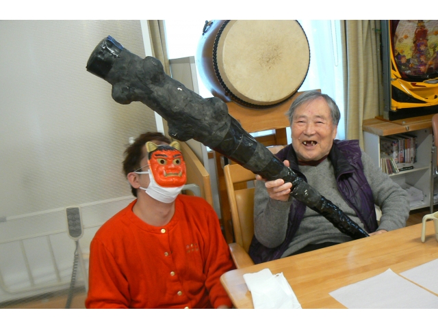 利用者の皆様鬼に向かって「鬼は外!福は内!」と楽しそうに豆まきで鬼退治をされていました。