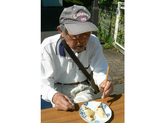天気がいい日だったので外で「若鮎」を仕上げていきます♪生地にあんこを包んでチョコを付けたお箸でお顔を書いていきます。皆様それぞれ個性あふれる可愛らしい若鮎が完成しました(*^^*)