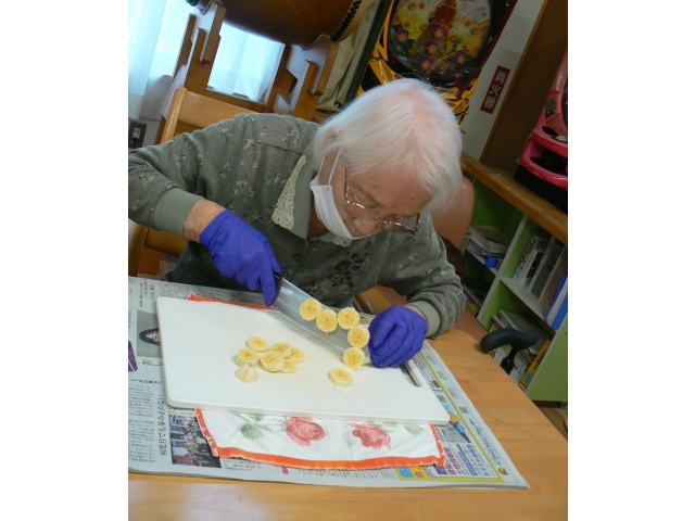 利用者様にバナナを切っていただいたり、ホットケーキを焼いていただいたり分担をして準備していきます!!