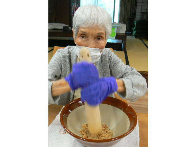 まずはすり鉢でくるみを潰してみそだれを作ります!!