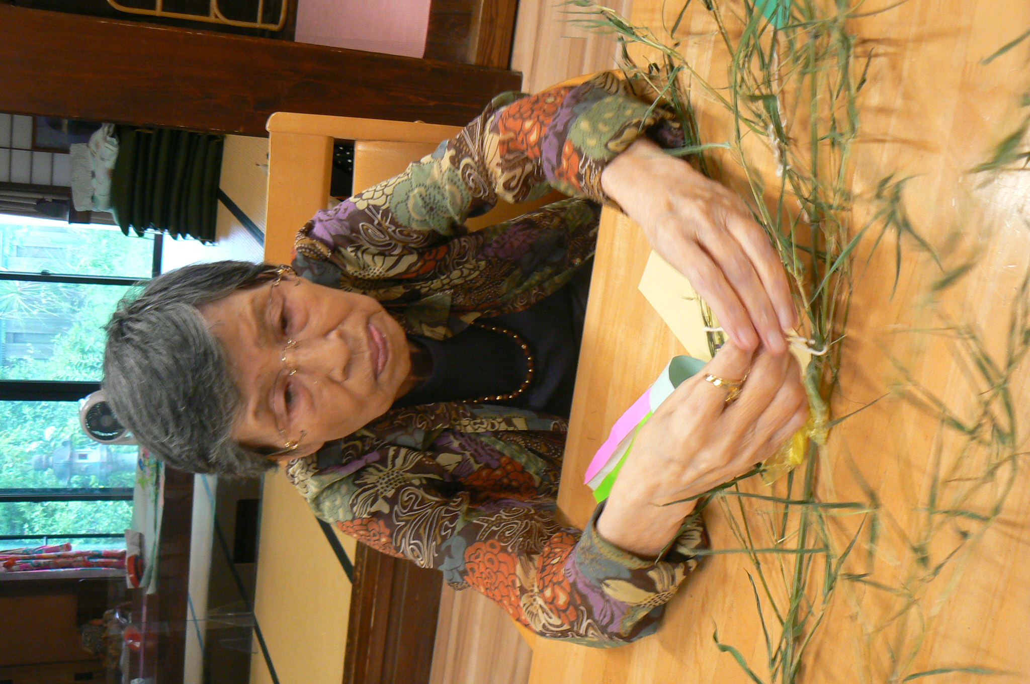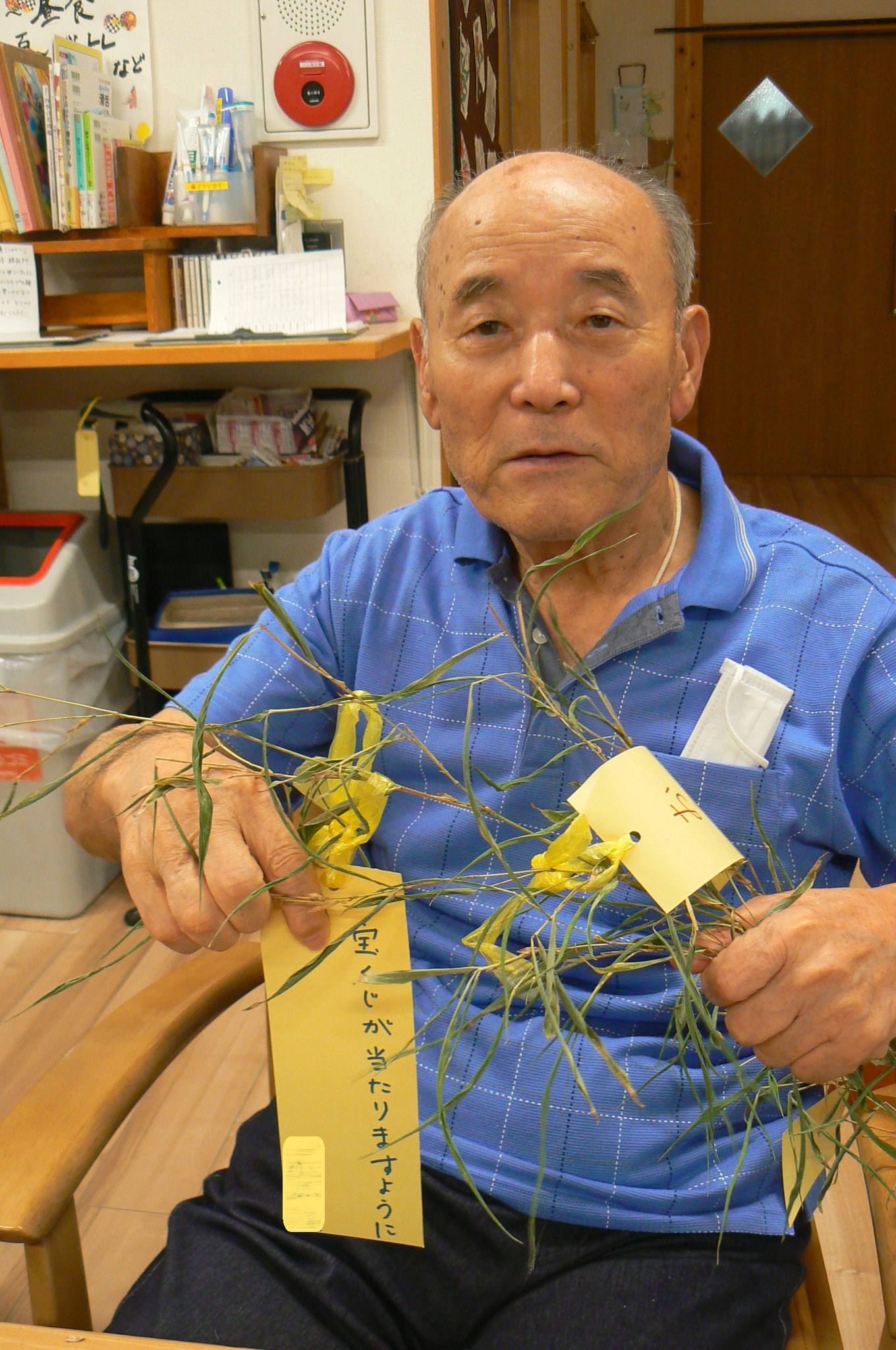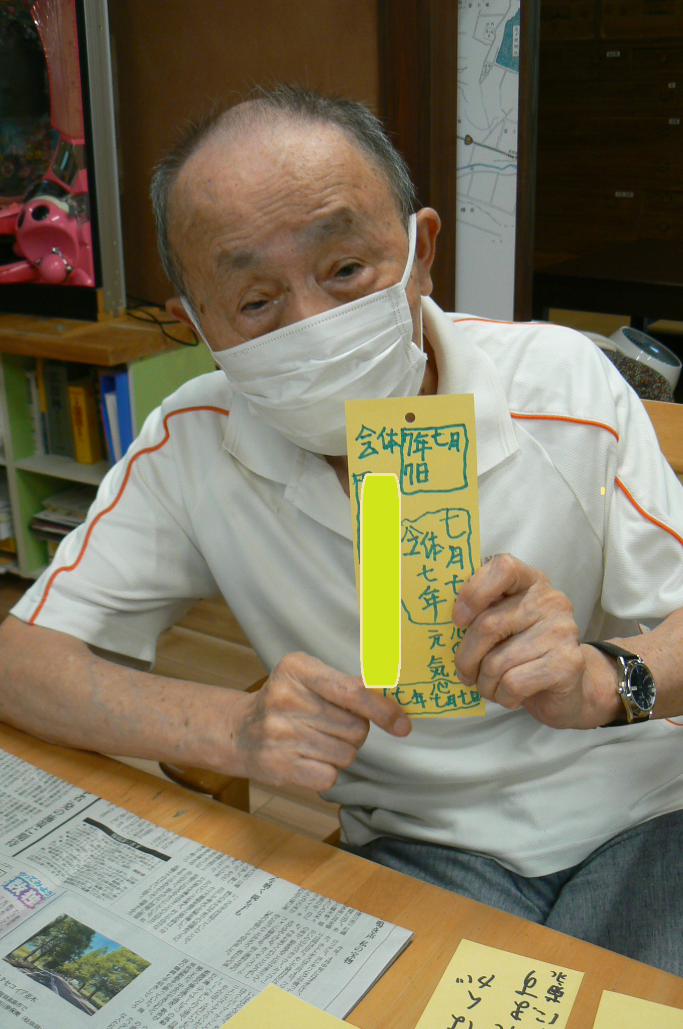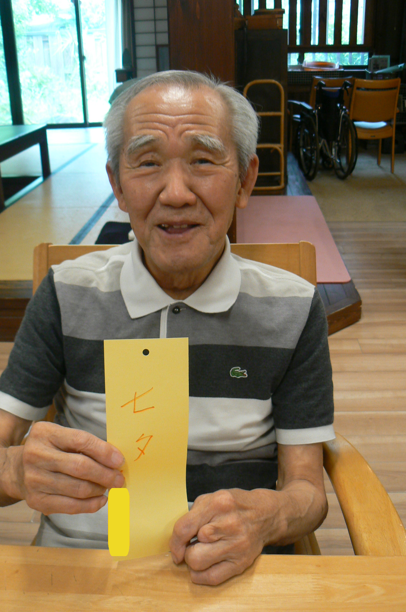 『7月』といえば七夕です。東郷庵では、毎年笹飾りを作ります。笹は、ちょうどいい長さにのこぎりで切り使用します。そのあと、短冊に様々なお願い事を書いていただいて笹に結んでいただきました♪
