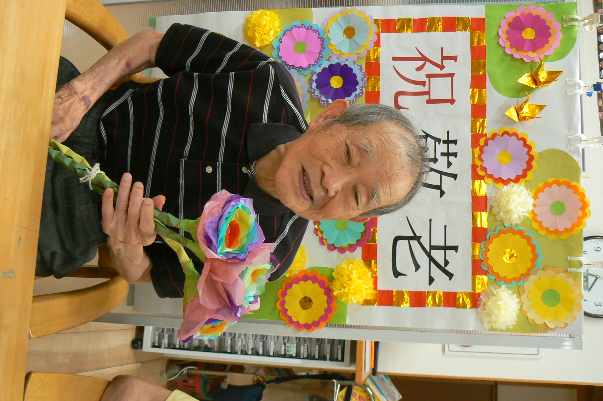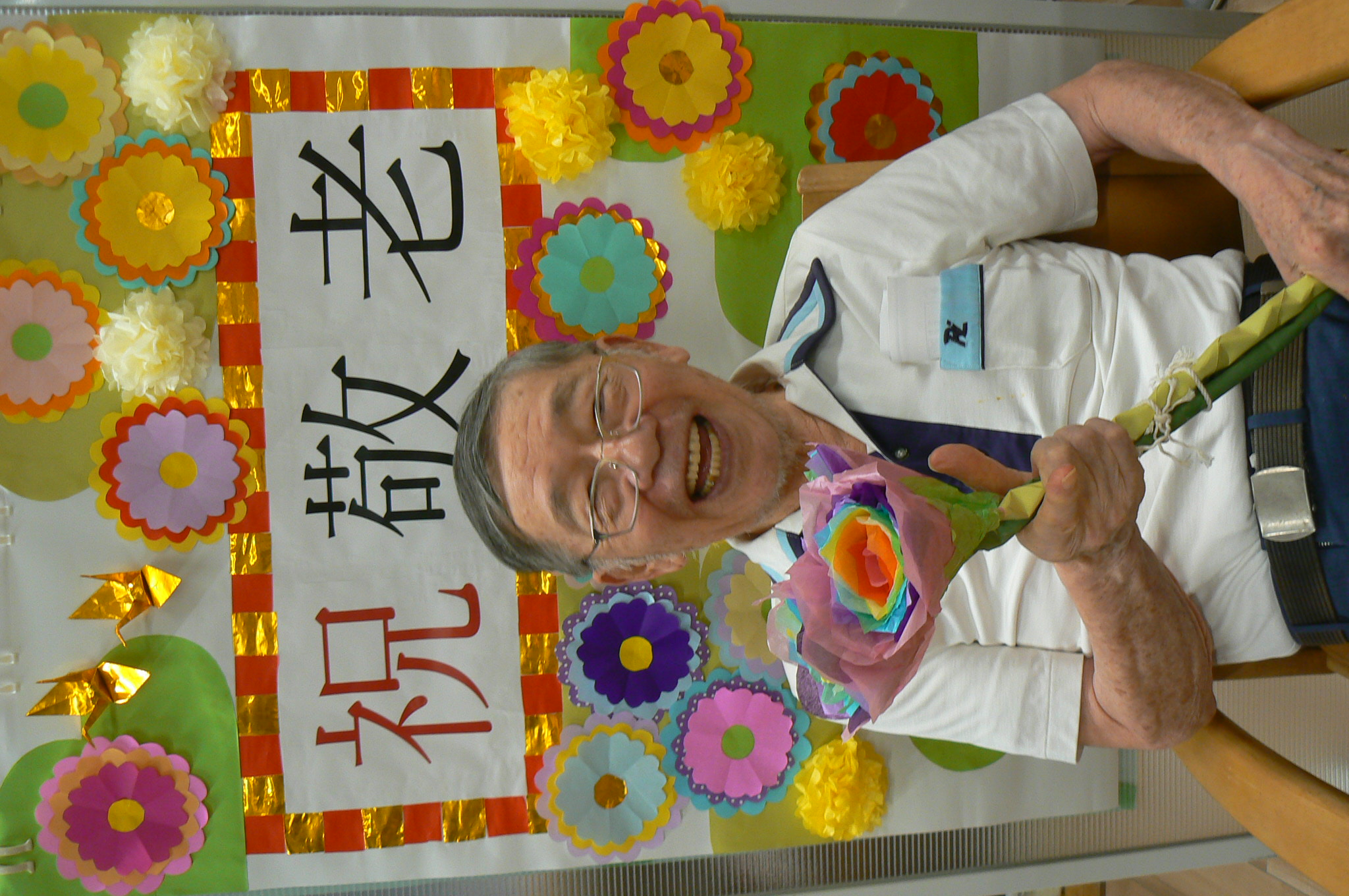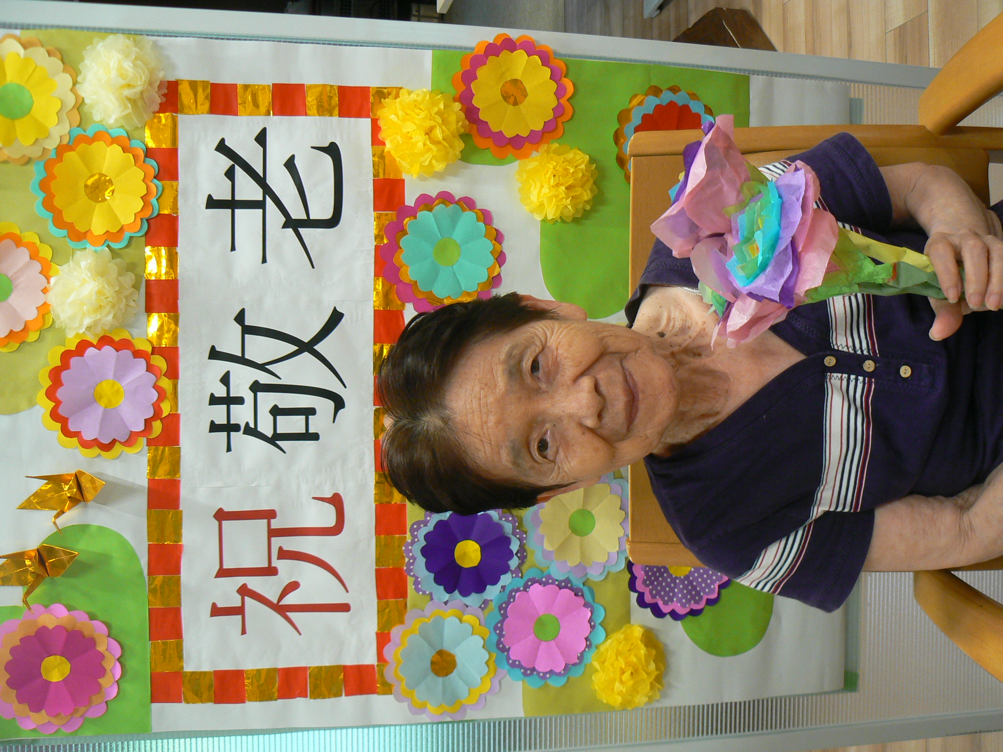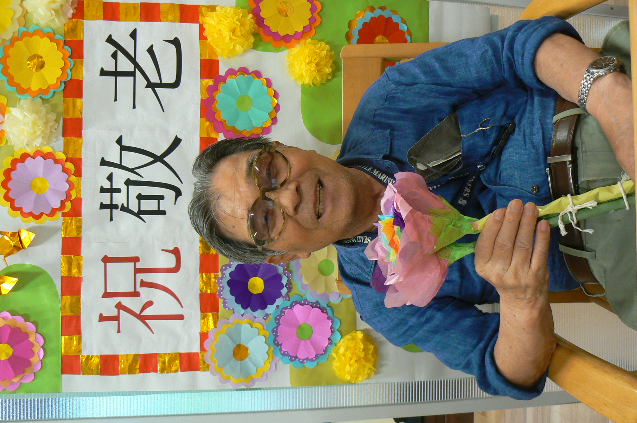 9月と言えば、利用者様が主役の『敬老の日』があります。今年は職員お手製の素敵な壁紙を背景に虹色の紙製のお花を持って記念撮影をすることにしました。 いざカメラを向けられると、緊張からかなかなか自然な表情が見られませんでしたが、職員が「今日一番の素敵な笑顔でお願いしまぁす!」と伝えると皆様とても若々しい笑顔で写真に写ってくださいました。 来年の敬老の日も素敵な笑顔が見られるといいです✨