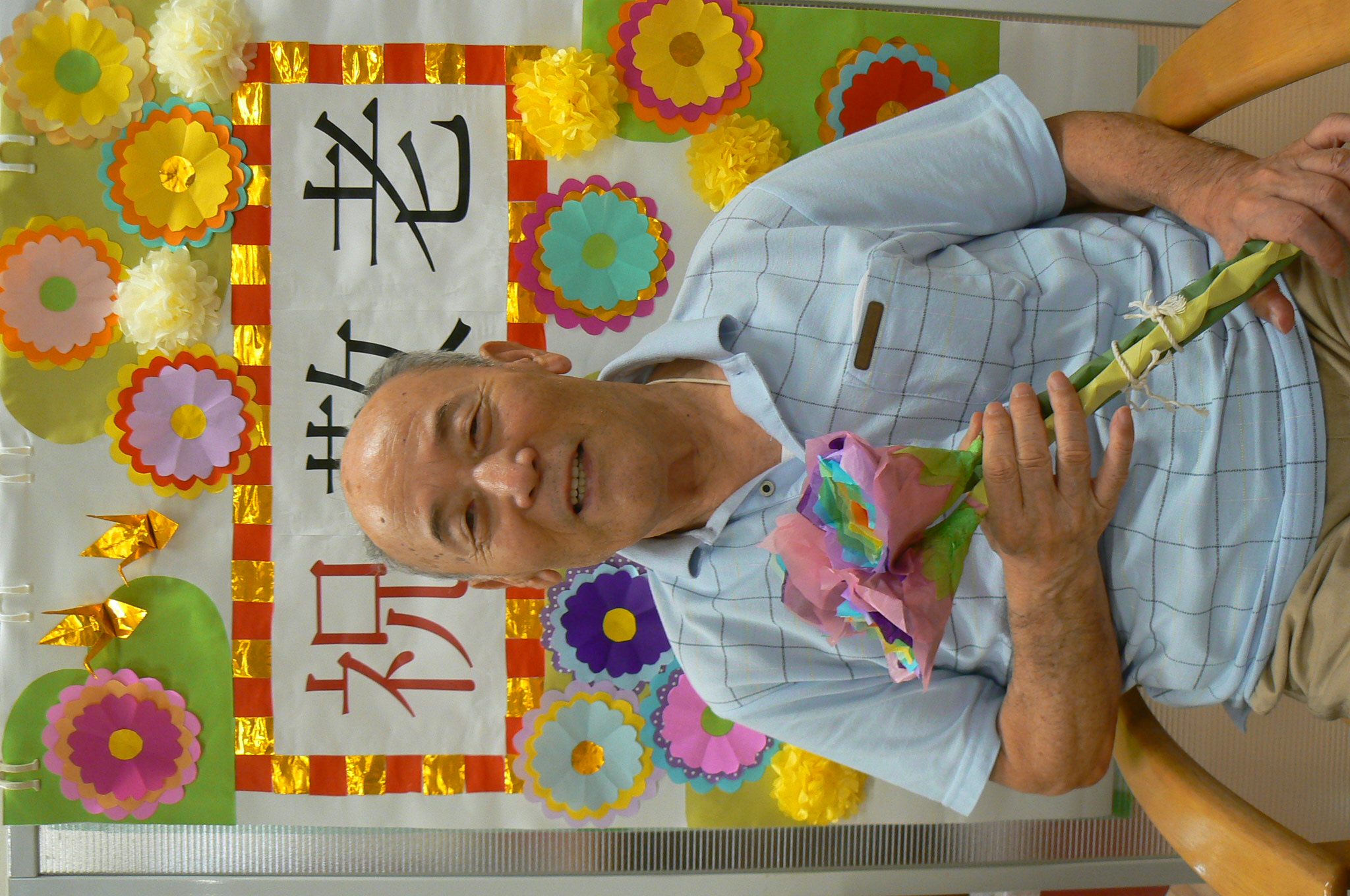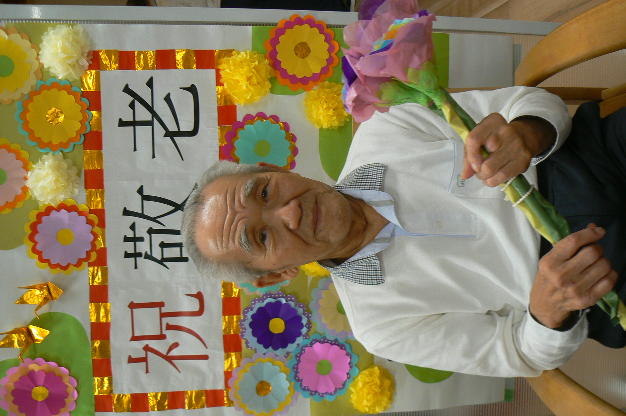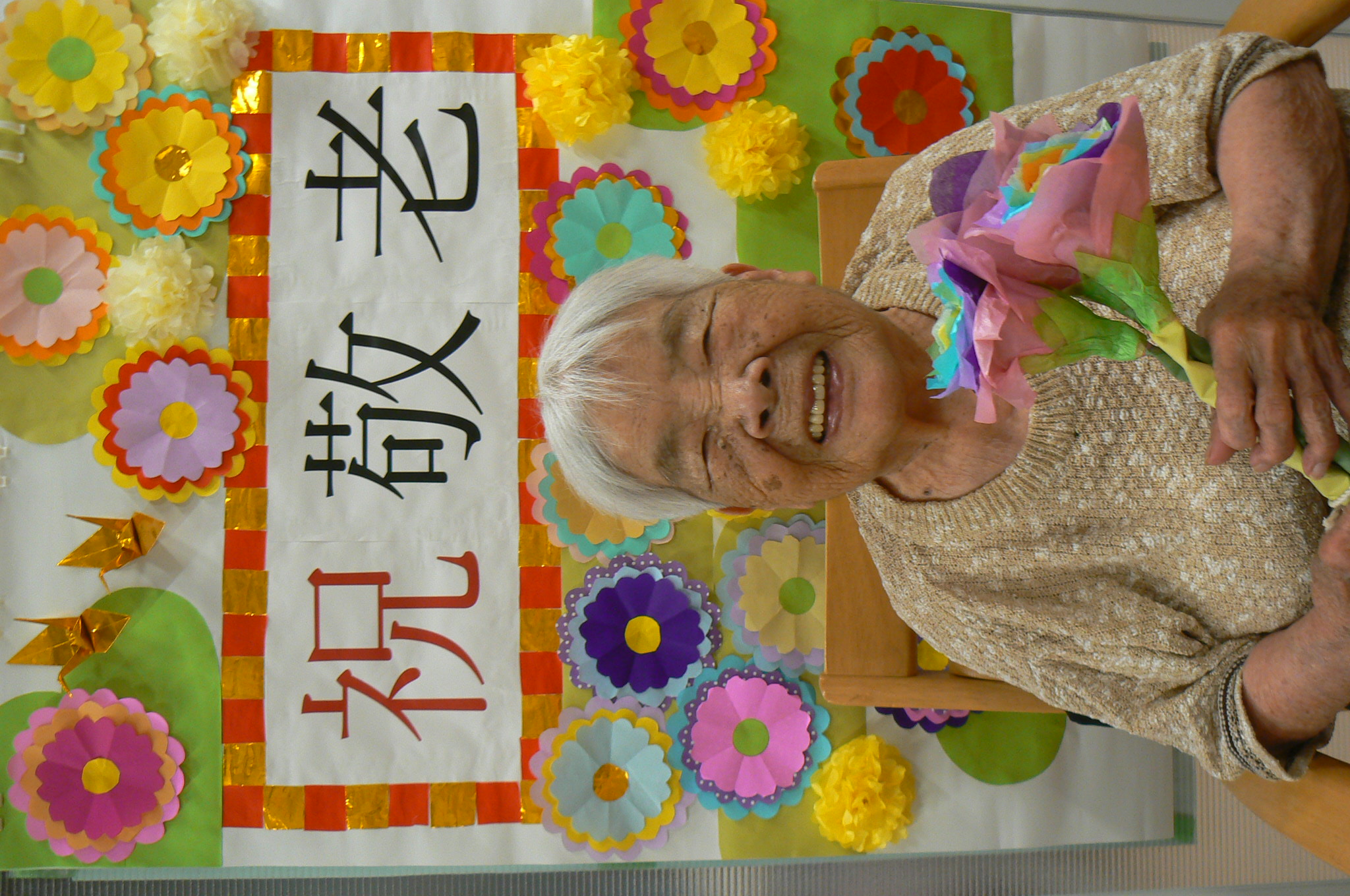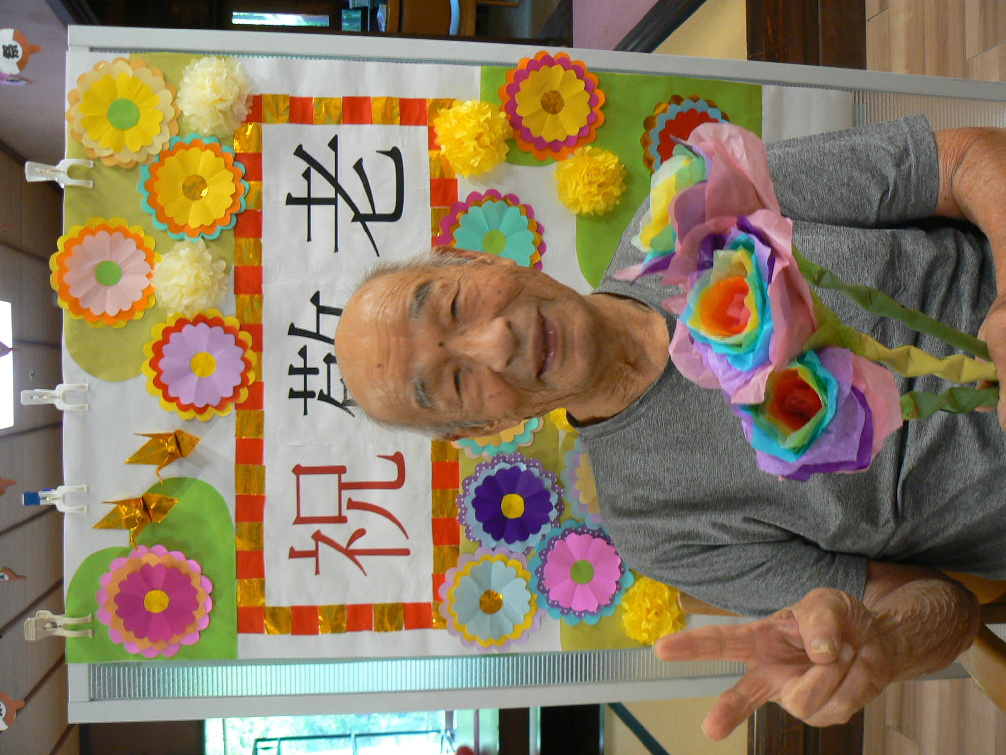 9月と言えば、利用者様が主役の『敬老の日』があります。今年は職員お手製の素敵な壁紙を背景に虹色の紙製のお花を持って記念撮影をすることにしました。 いざカメラを向けられると、緊張からかなかなか自然な表情が見られませんでしたが、職員が「今日一番の素敵な笑顔でお願いしまぁす!」と伝えると皆様とても若々しい笑顔で写真に写ってくださいました。 来年の敬老の日も素敵な笑顔が見られるといいです✨