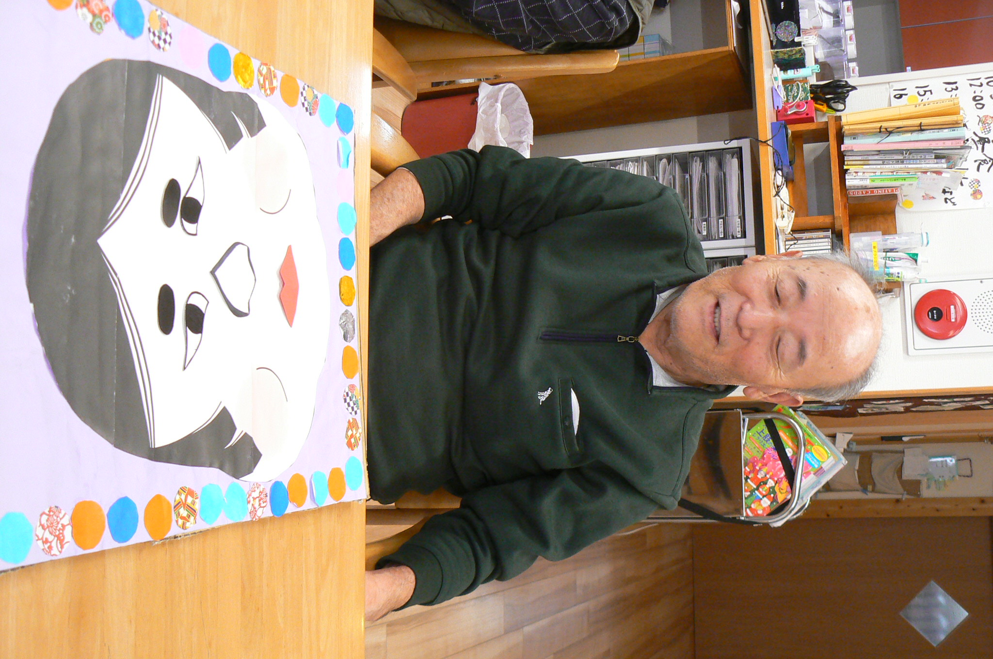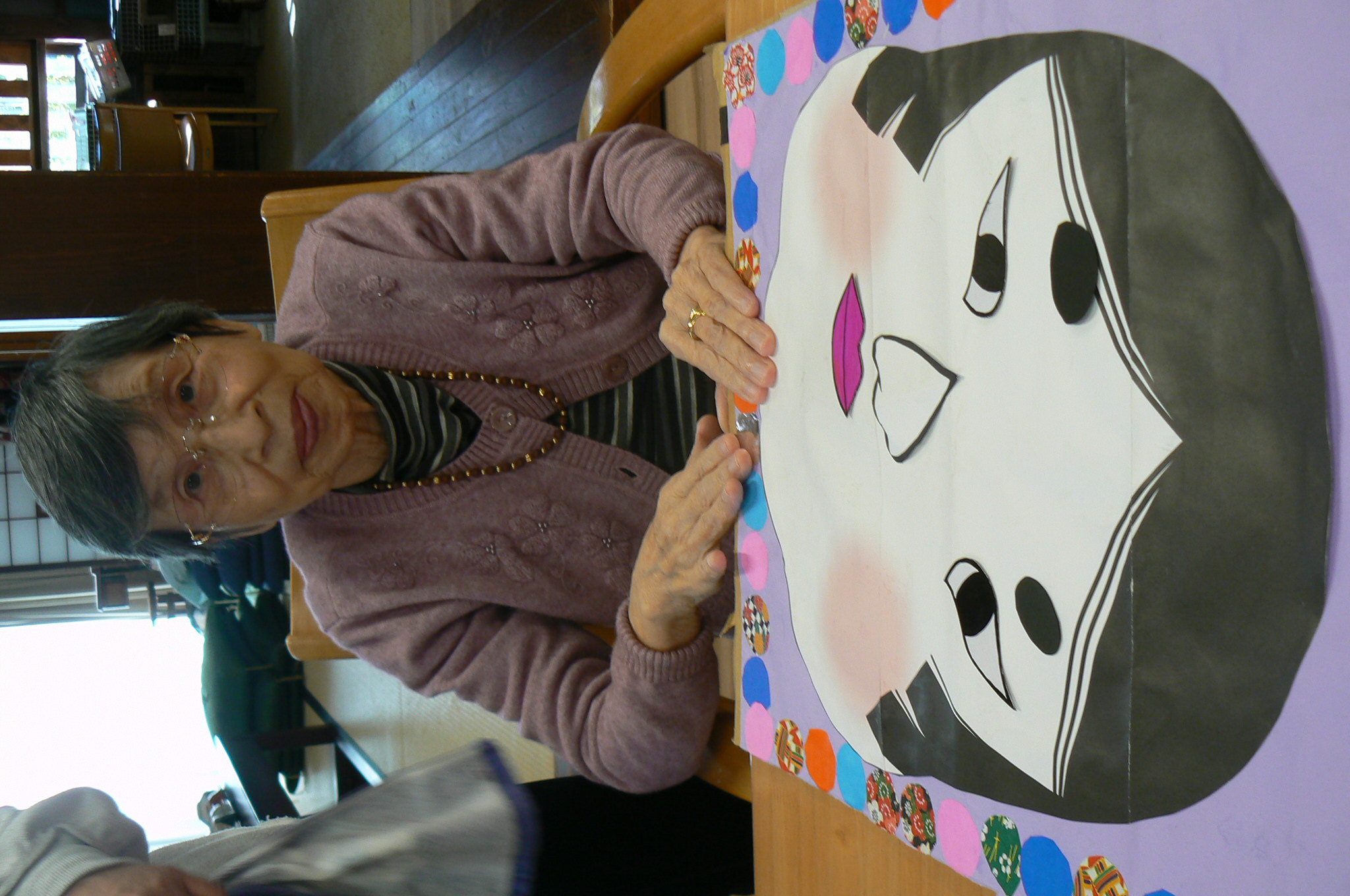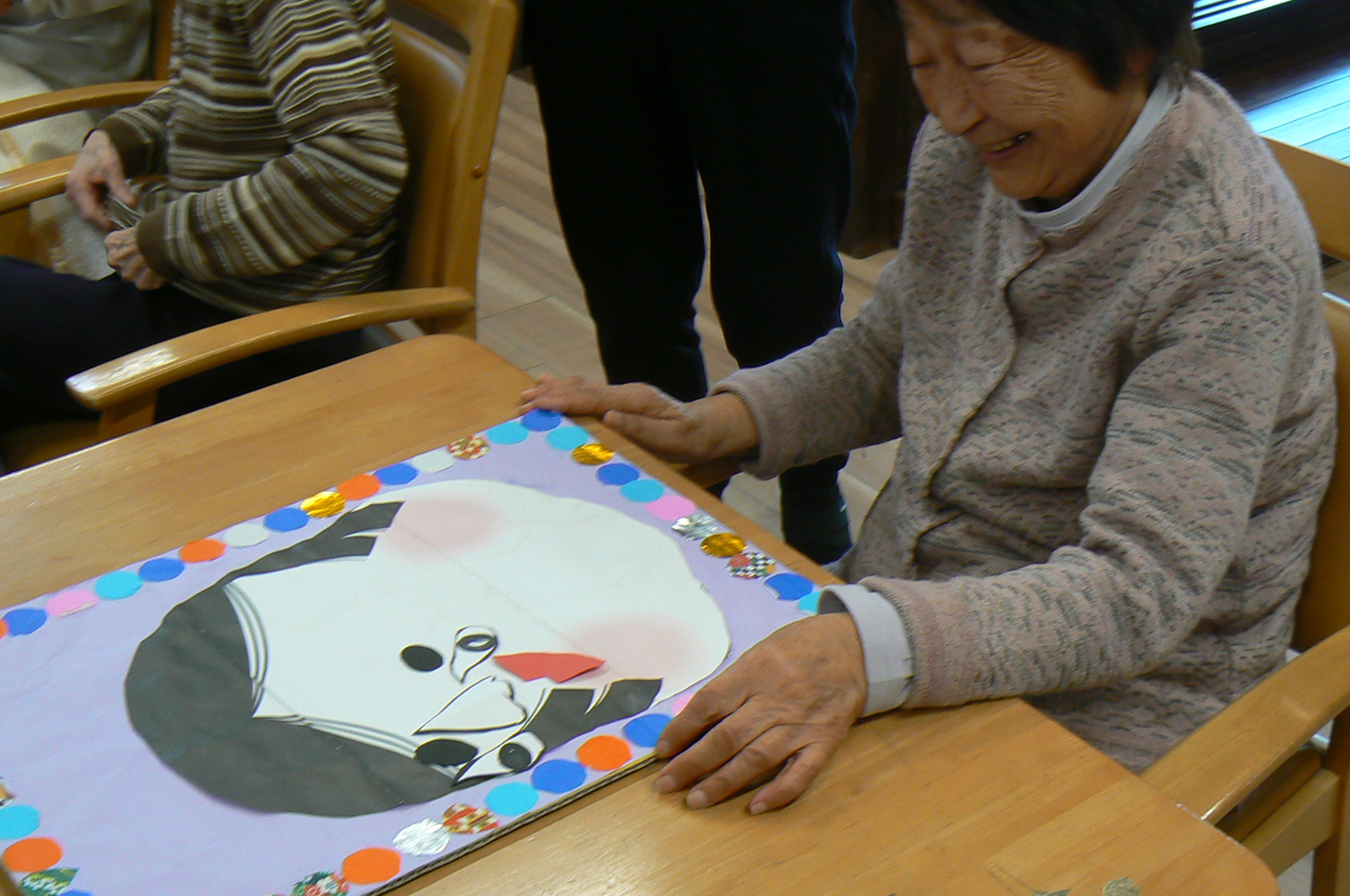 利用者様はタオルで目隠しをし、職員がお多福さんの顔のパーツを一つずつ手渡しし、手の感触を頼りにお多福さんの顔を完成させるのです。