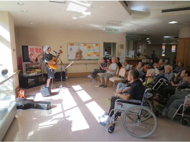 バイキングでお腹いっぱい食べてひと休みした後、午後からデイルームで歌を聴いて過ごしました。さわやかな歌声に誘われて、気持ちよく一緒に口ずさんでいました。