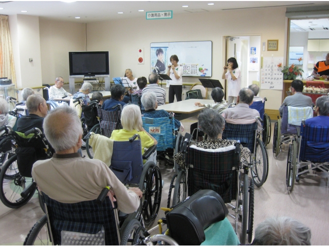8月1日 三つ葉のクローバーさんが来苑されました。三つ葉のクローバーさんは、毎月ボランティアにてギターやオカリナの演奏をしてくださっています。曲の間には、手遊びやトークで盛り上げてくださいます。ご利用者さんは、懐かしいメロディを聴きながら「昔のことを思い出したよ。」とほっこりされていました。いつもありがとうございます。