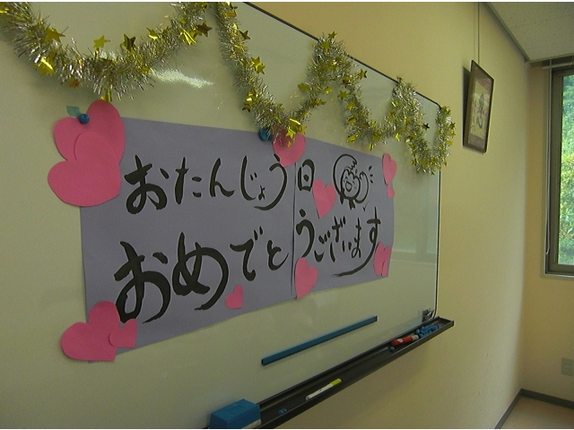 あいにくの雨模様ではありましたが、今日は誕生会でまた変わった試みを。一部屋を飾り付けて、お誕生日会を行いました。事前に選んでもらったケーキを少しおしゃれに盛り付けました♪