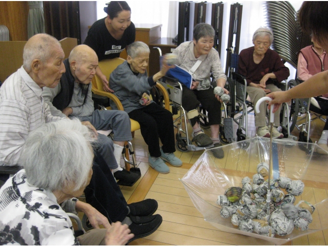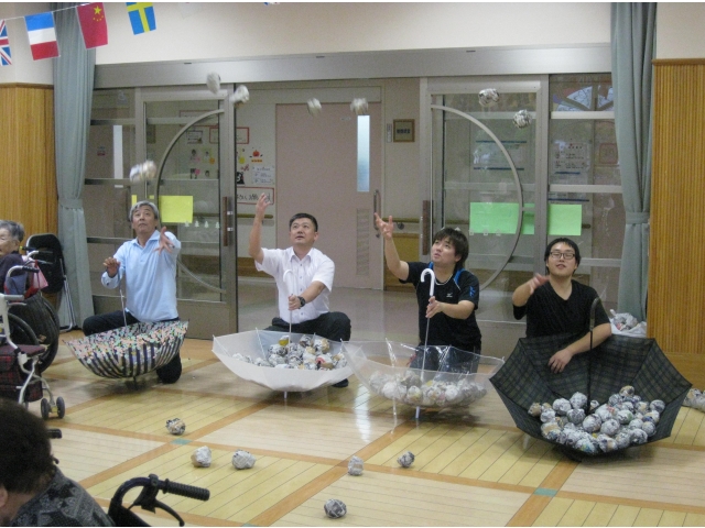 チームリーダーが抱える傘にみんなで玉を入れていきます。